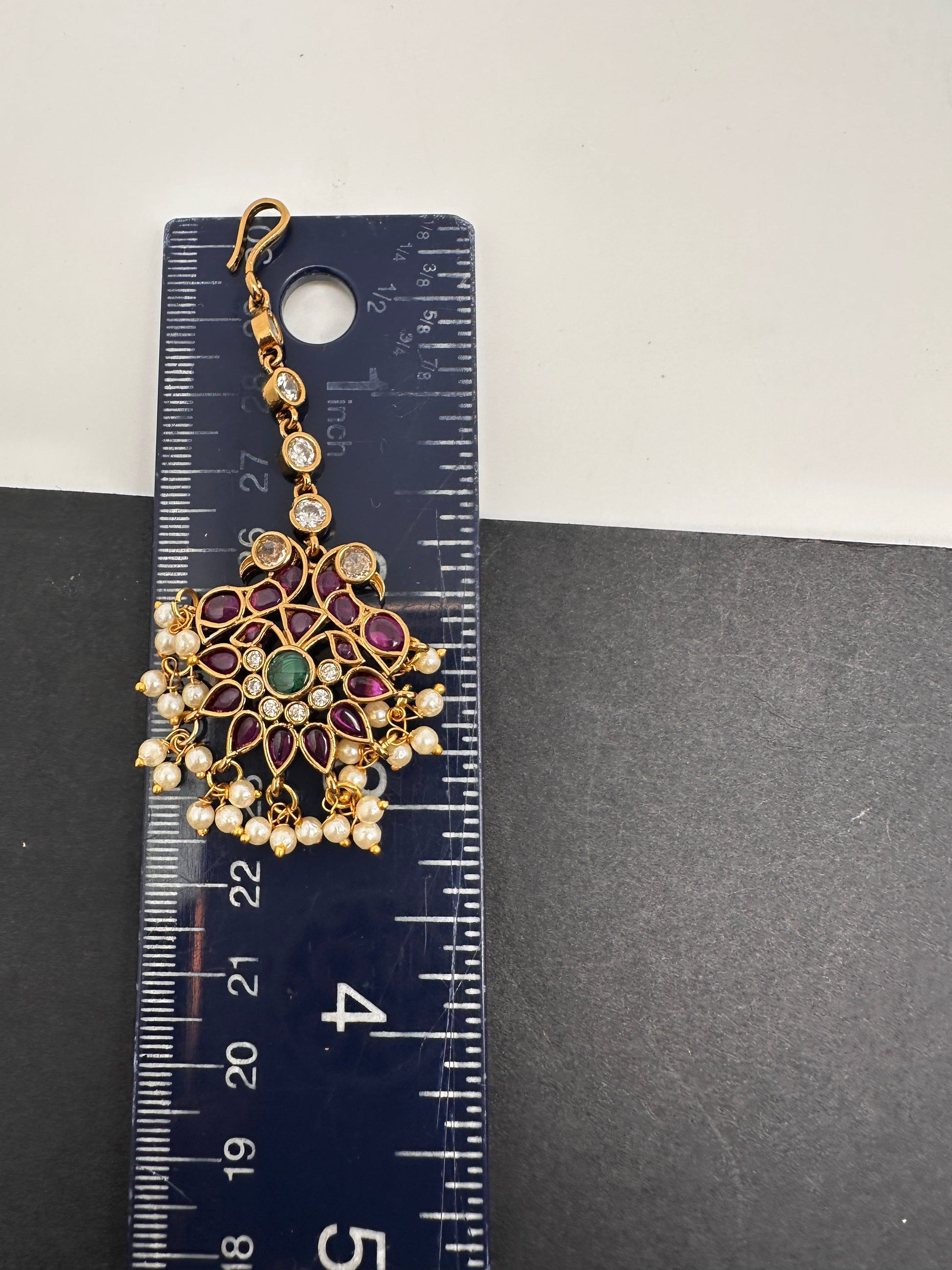 Matte Kempu Mang TikaColor : MatteSize : Length : Approx 3 inchesStones : Red Green Stone CZ Pearls