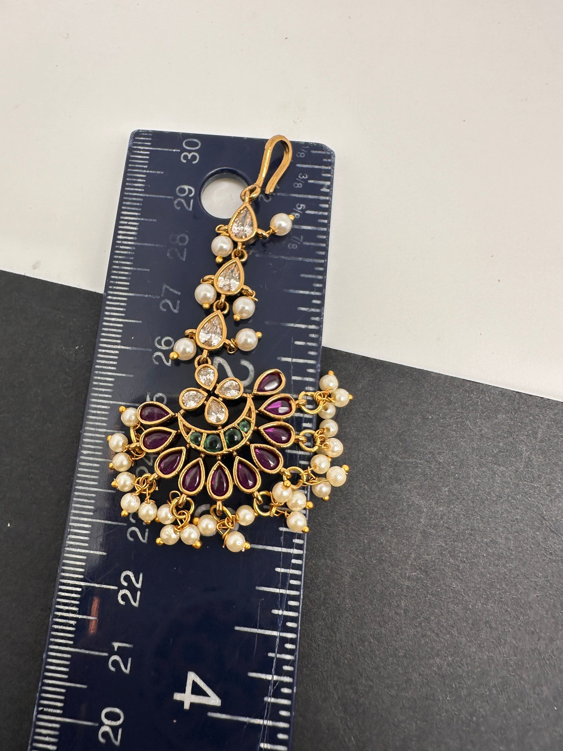 Matte Kempu Mang TikaColor : MatteSize : Length : Approx 3 inchesStones : Red Green Stone CZ Pearls
