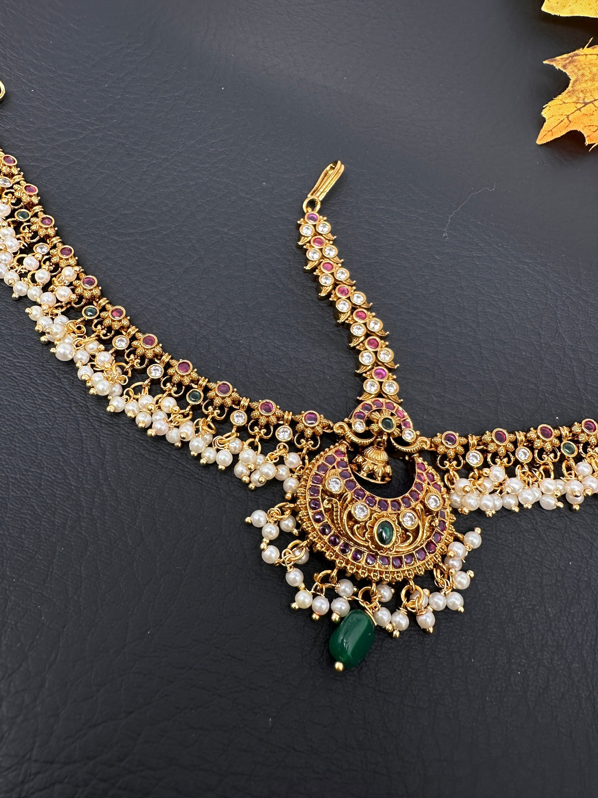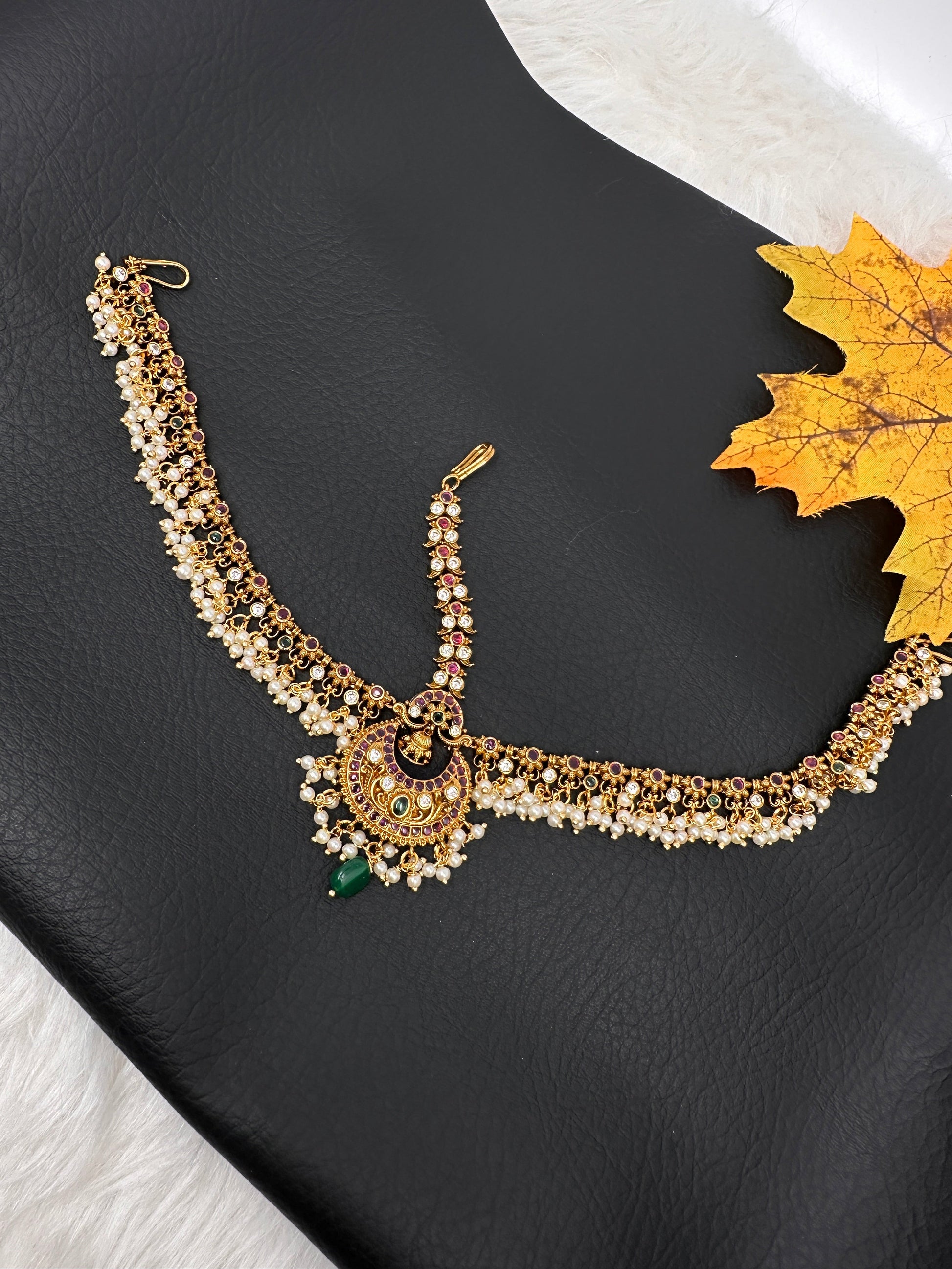 Matte Kempu Pearls Maangteeka Mathapatti Color : GoldenSize : Length : Approx 8 inchesStones : Green Stone