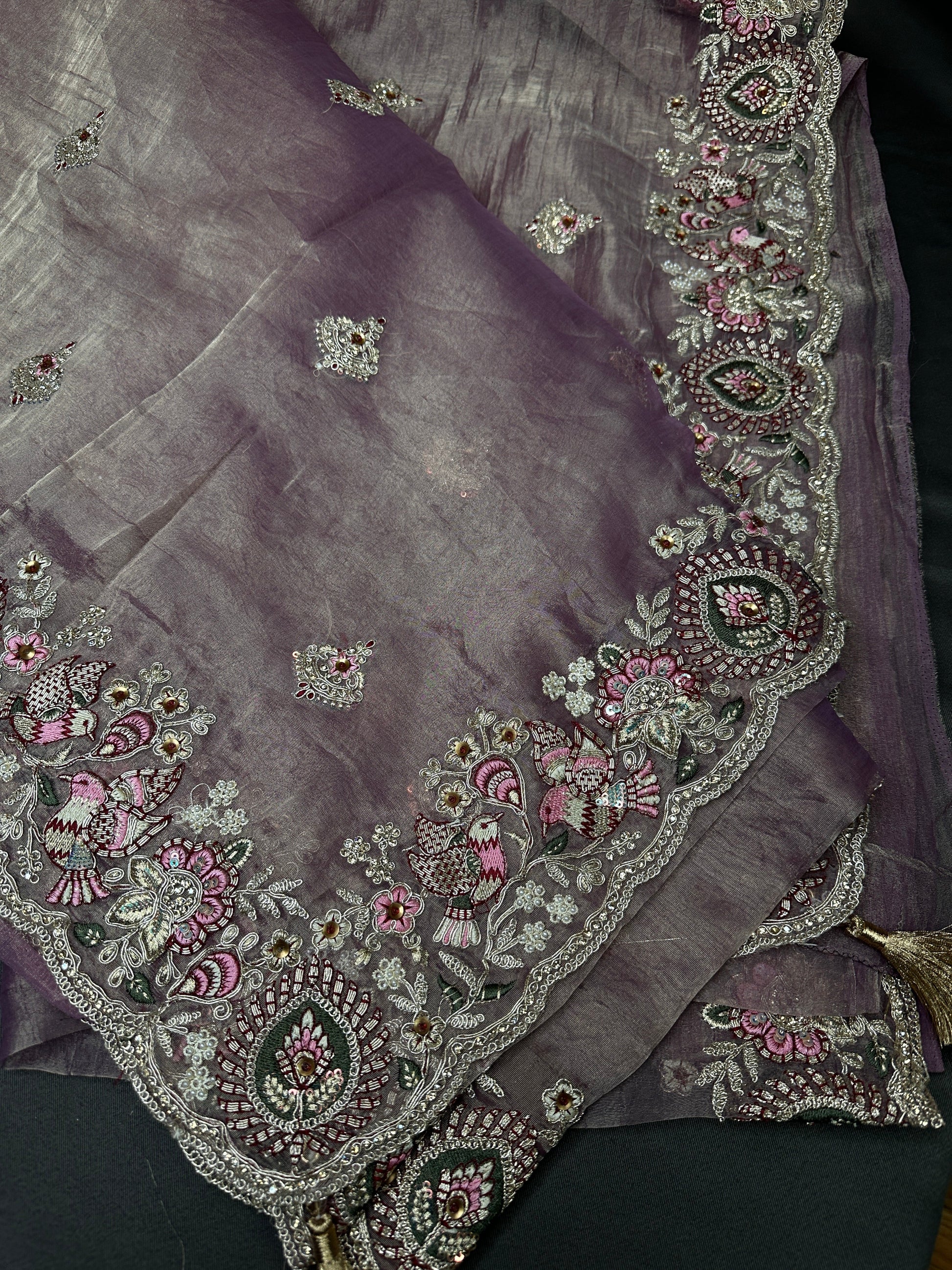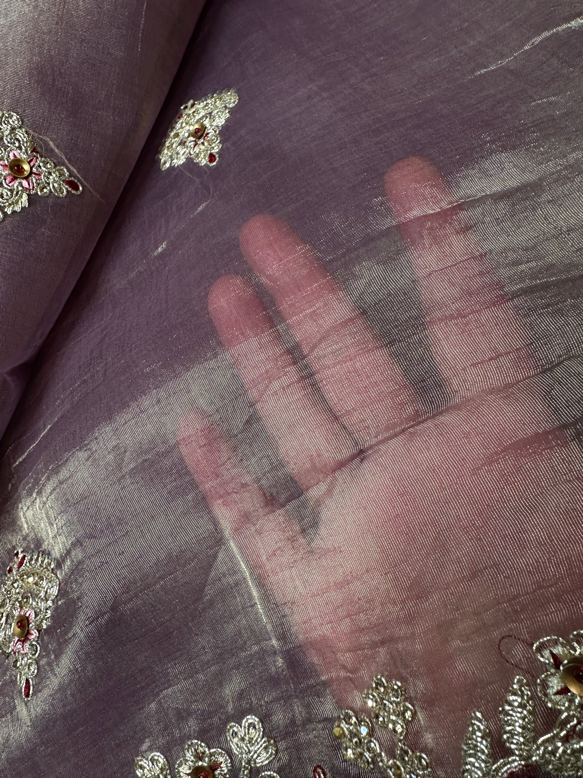 Mauve Organza Designer Tissue Sequence Saree Saree Details : Mauve Color Saree Fall and Pico done, Blouse is front open Blouse Details : Mauve Purple Blouse Size 38 and has margin to go up to Size 42; Sleeves Length : 8 Inches: Blouse Length : 15 Inches; Front Neck : 7.5Inches; Back Neck : 10 Inches