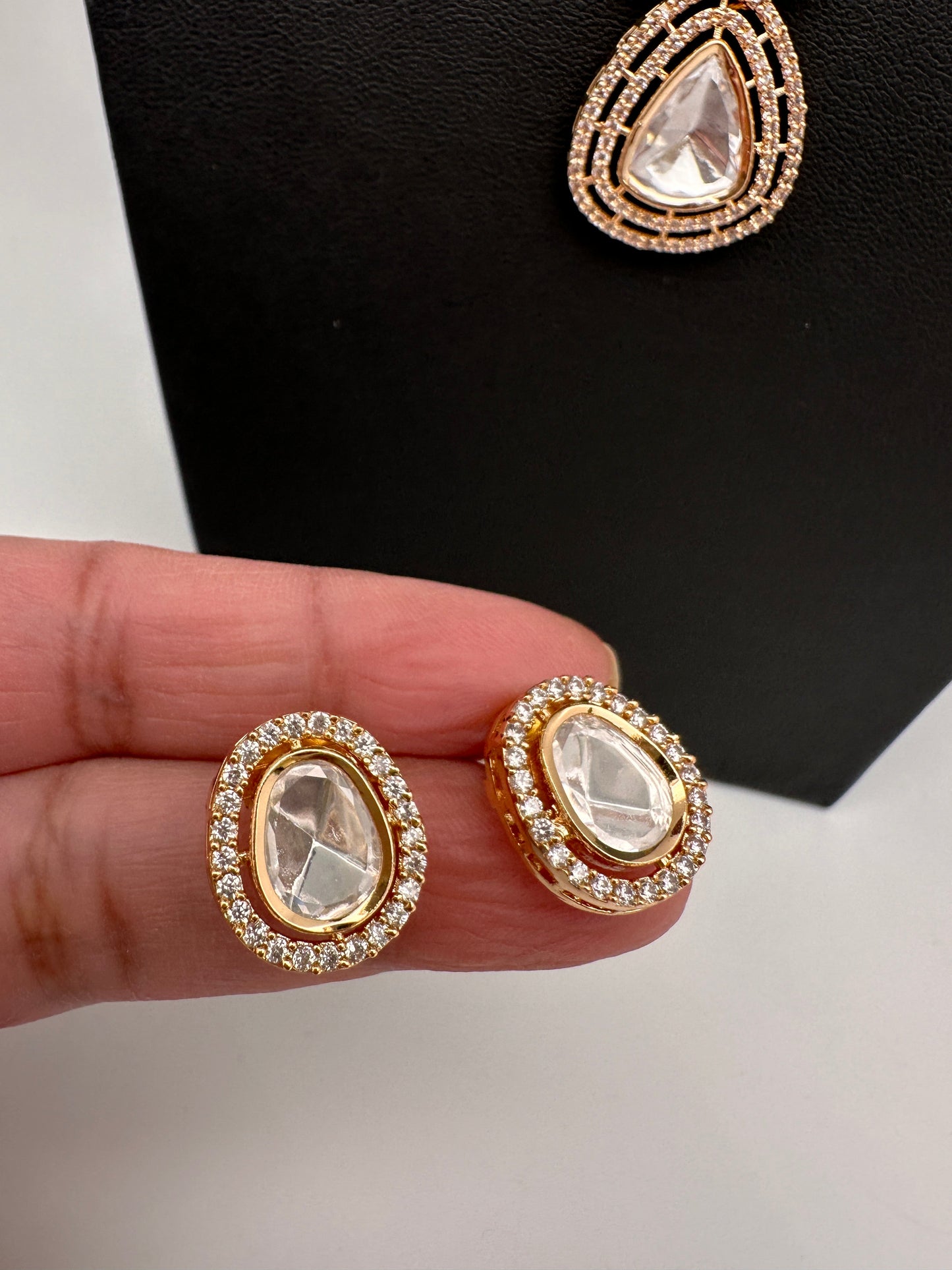 Moisaanite Double Layer Chain Dainty Chain Necklace with Matching StudsColor : GoldenSize : Nekclace Length : 24 Inches approx; Earring Length : 1 Inches ApproxStones : Moissanite