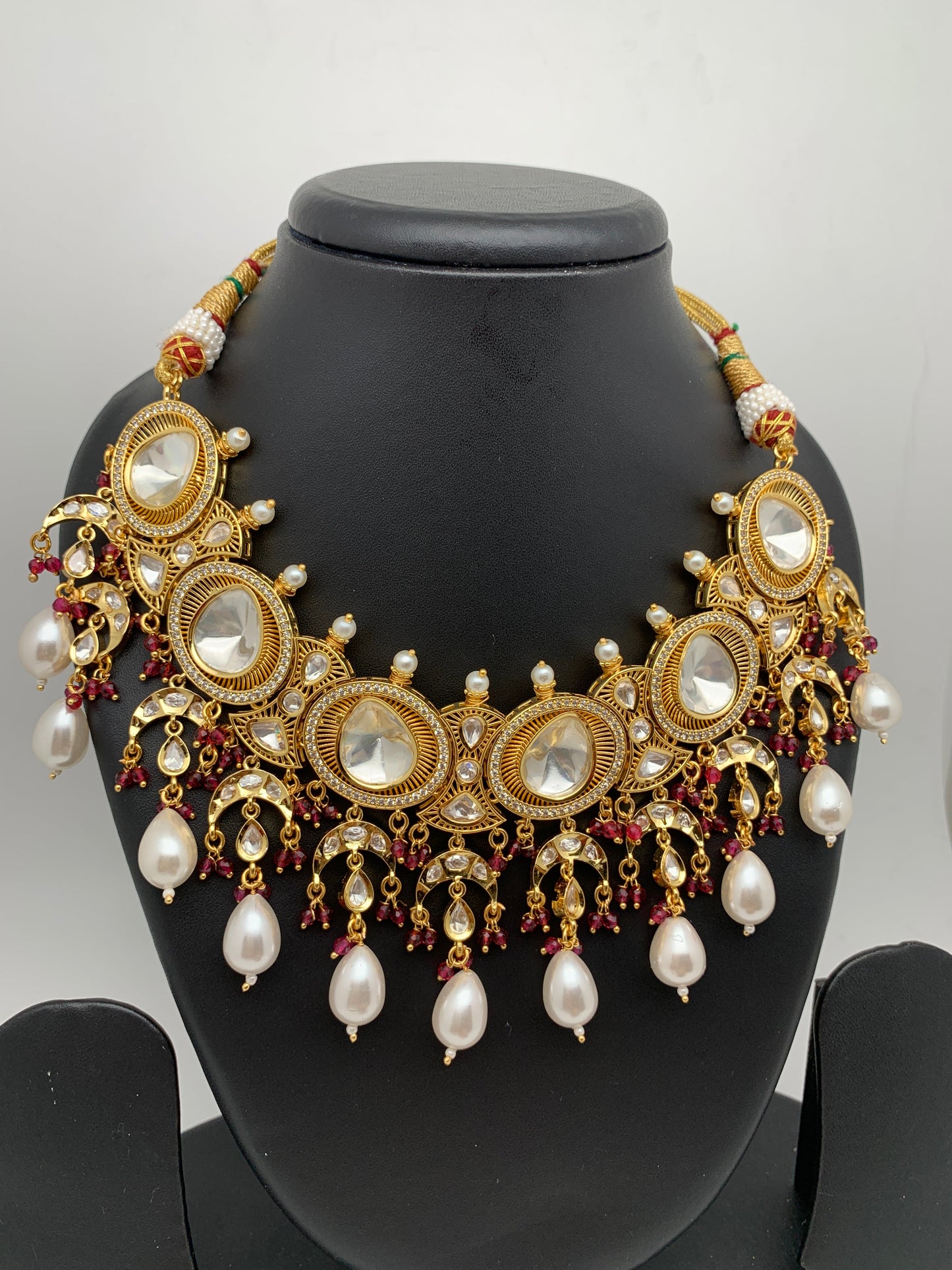 Moissanite Red beads Pearls Choker with matching earringsColor : GoldenSize : Earrings Length : 3 InchesStones : Moissanite Red Beads Pearls