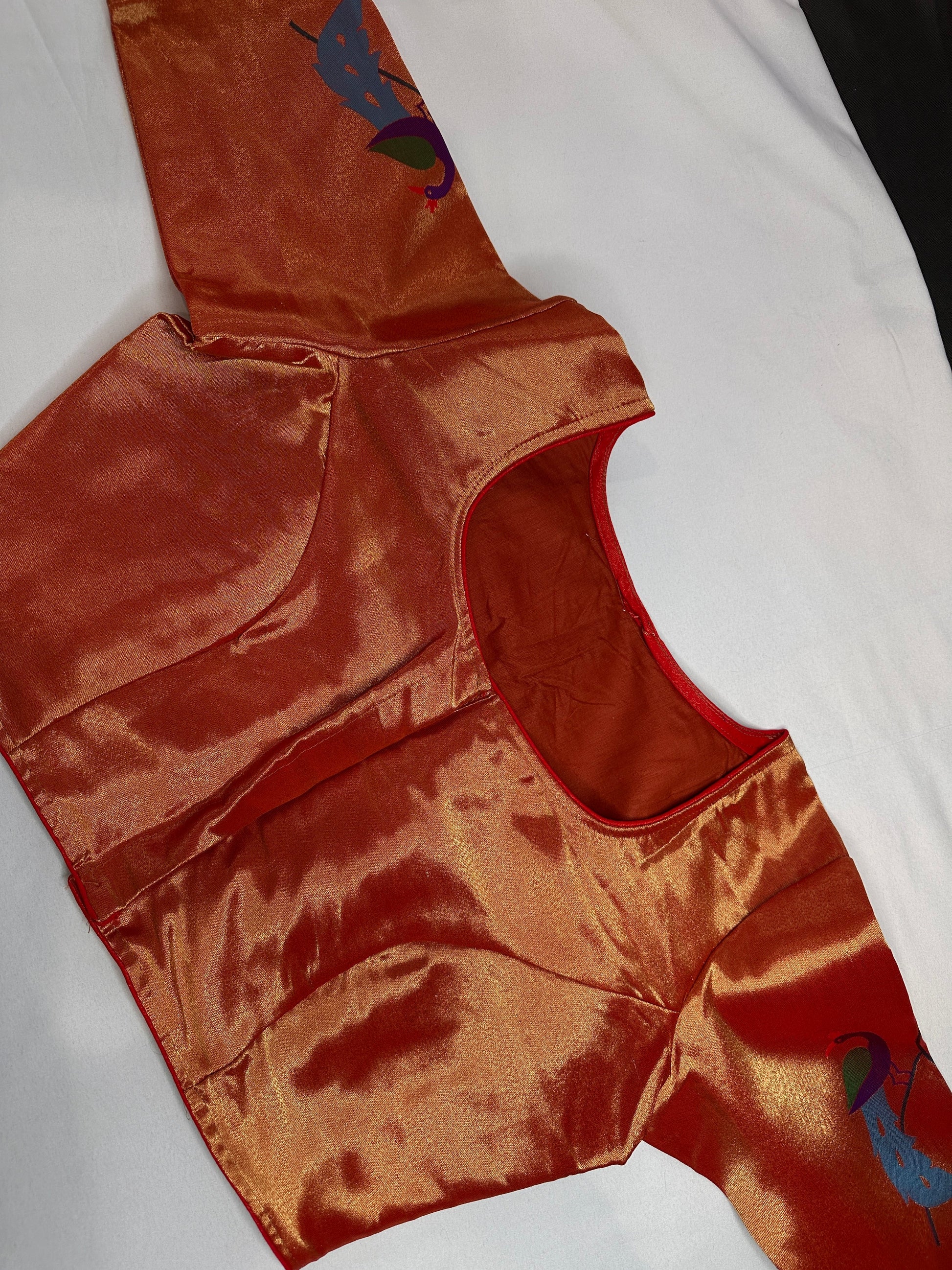 Orange Pure Painthani BlouseBlouse Details : Blouse Color : Orangish Red; Blouse stitched Size 42 and has margin to go upto size 48, Sleeves Length : 10.5 Inches, Blouse Length 15 Inches, FrontNeck : 4 Inches and Back Neck : High Neck