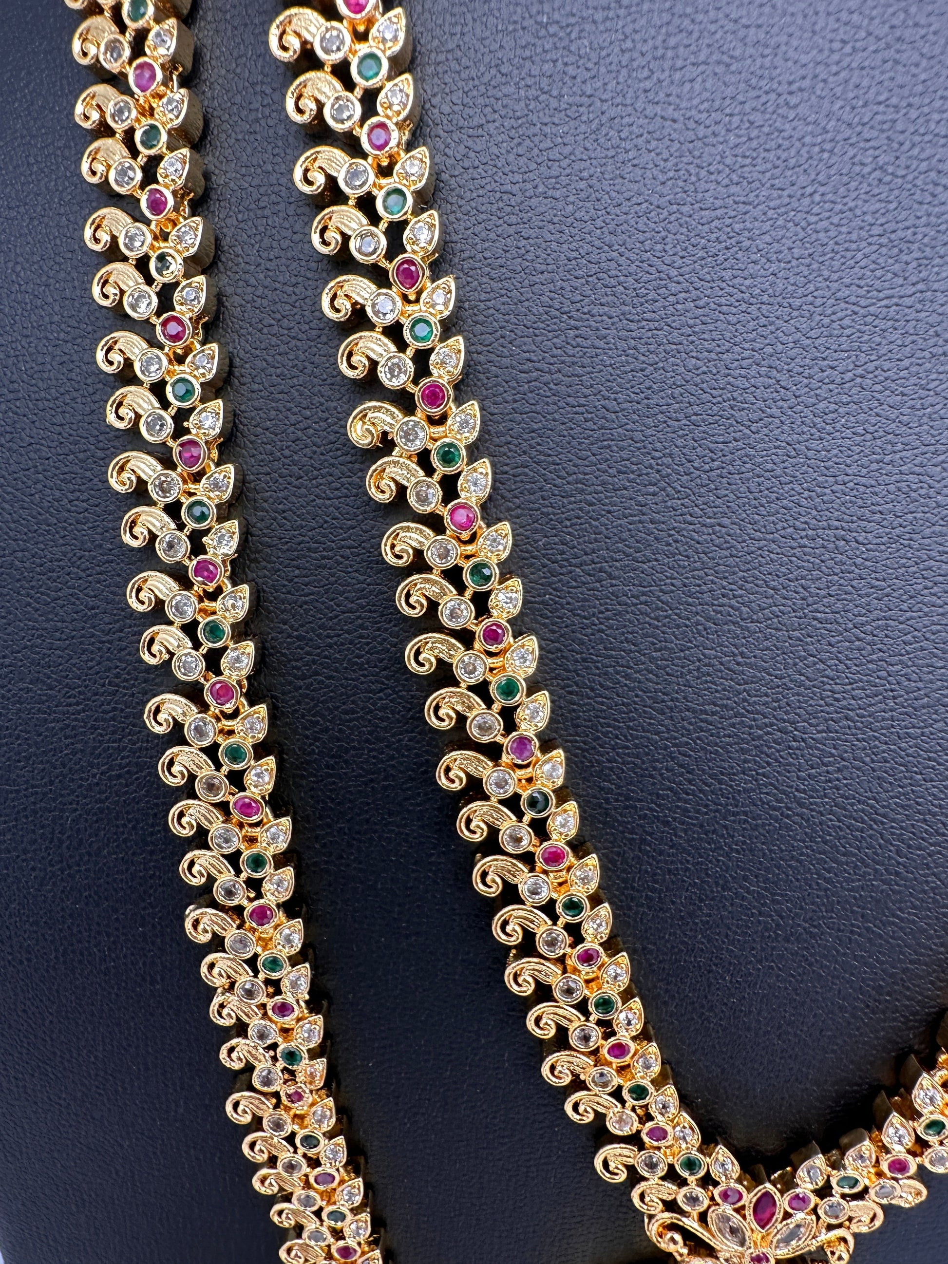 Peacock CZ Multi Stone Long Short Combo Necklace Set and matching jhumki Color : Golden AD Size : Haaram Length : Approx 24 Inches; Necklace Length : Approx 16 Inches; Earring Length : 1.75 Inches; Maang Teeka Length : Approx: 4.75 Inches Stones : American Diamond Red Green Stone Pearls