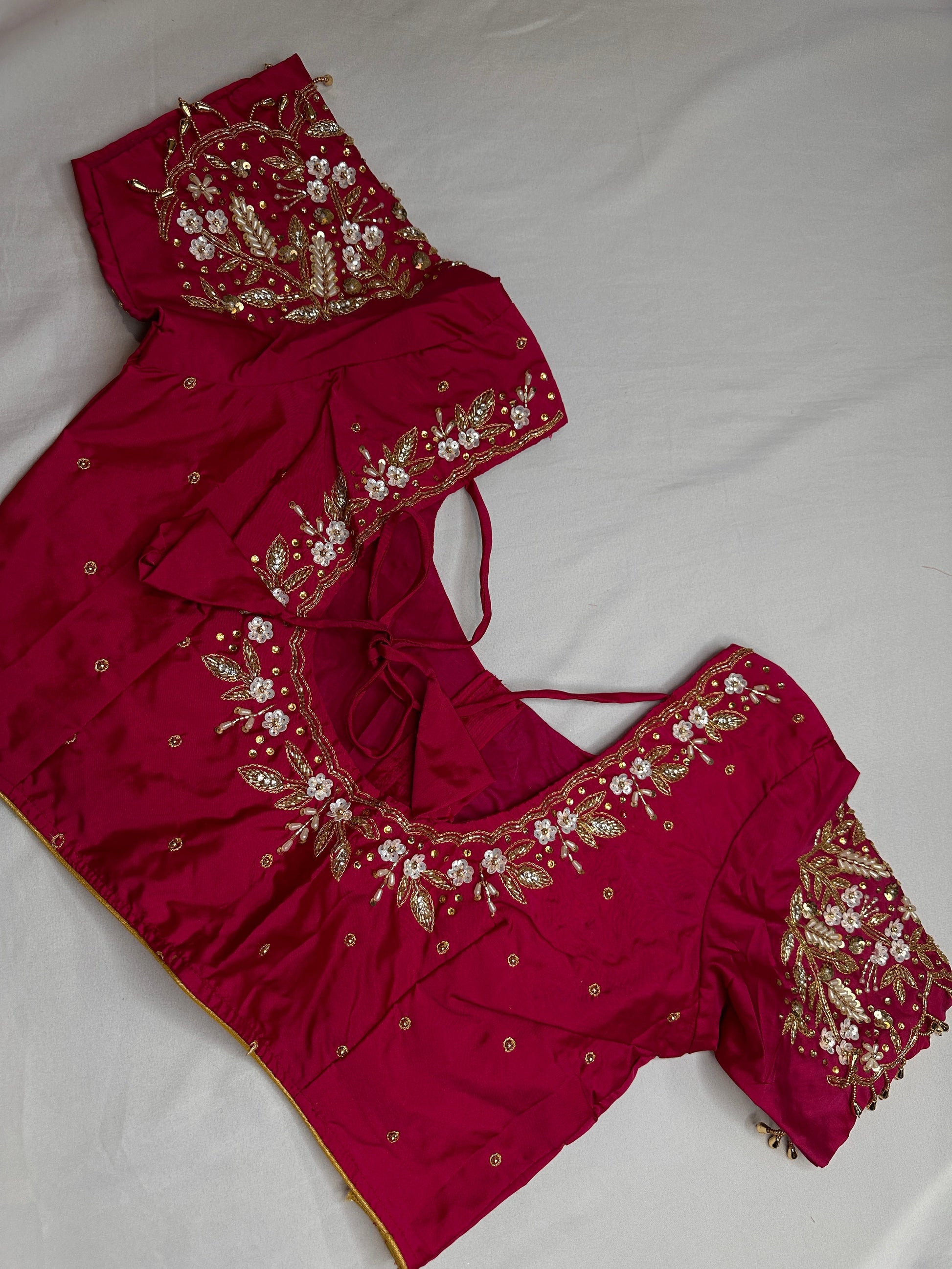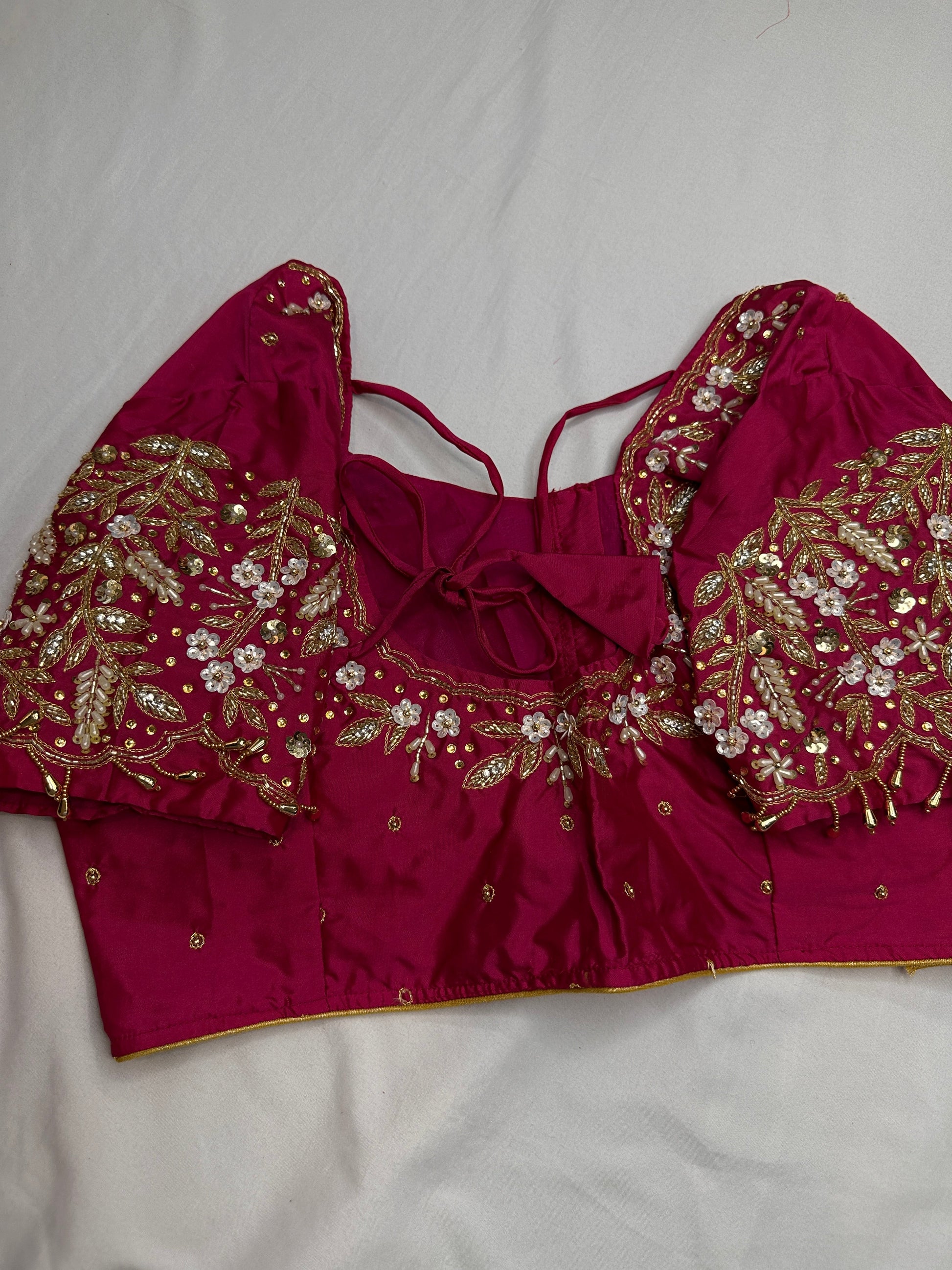 Pearl Maggam Pink BlouseBlouse Details : Blouse Color : Pink; Blouse stitched Size 38 and can be altered from 36 to 44, Sleeves Length : 8.5 Inches, blouse Length 14.5 Inches, FrontNeck : 7 Inches and Back Neck : 9.5 Inches;