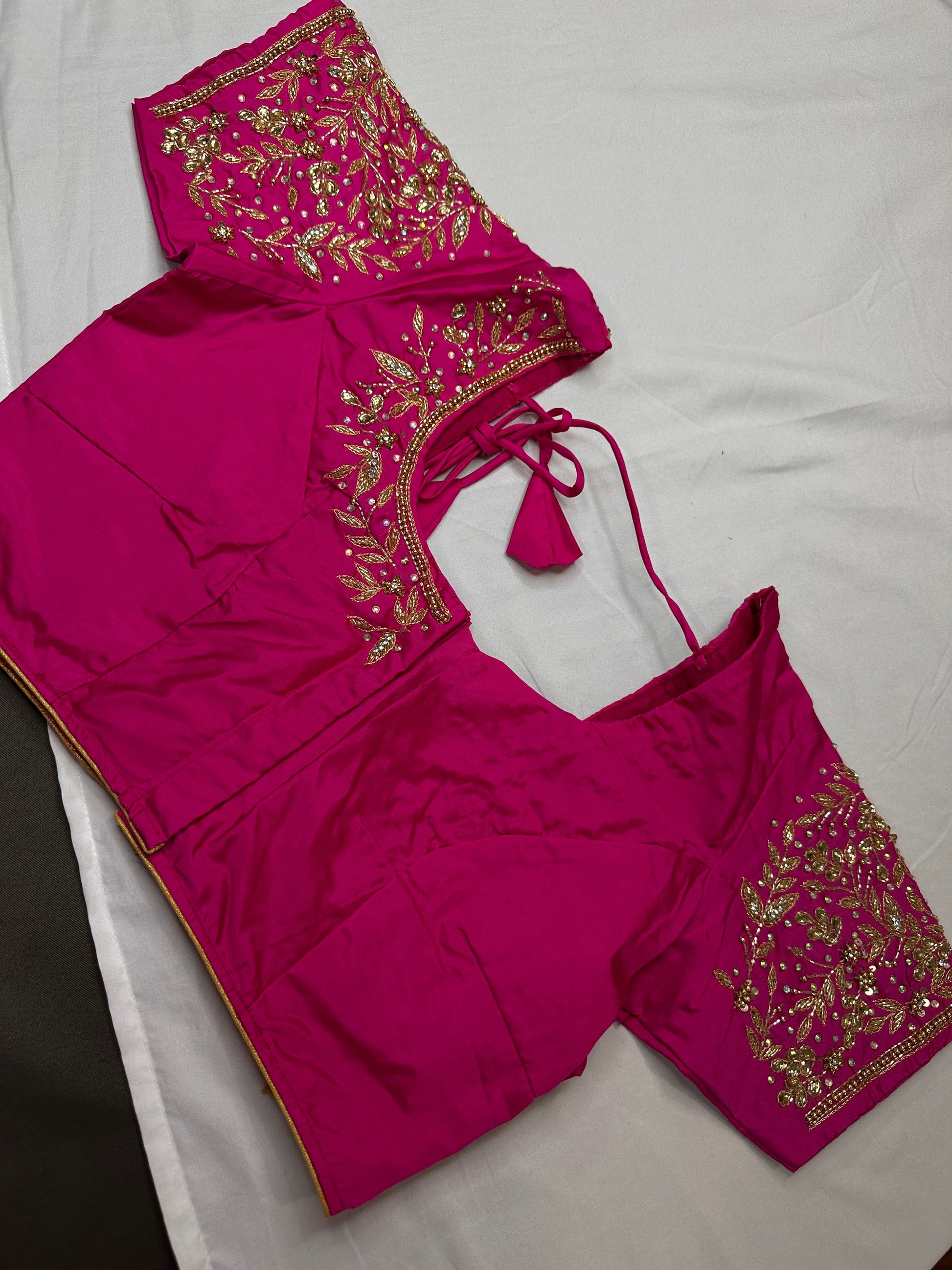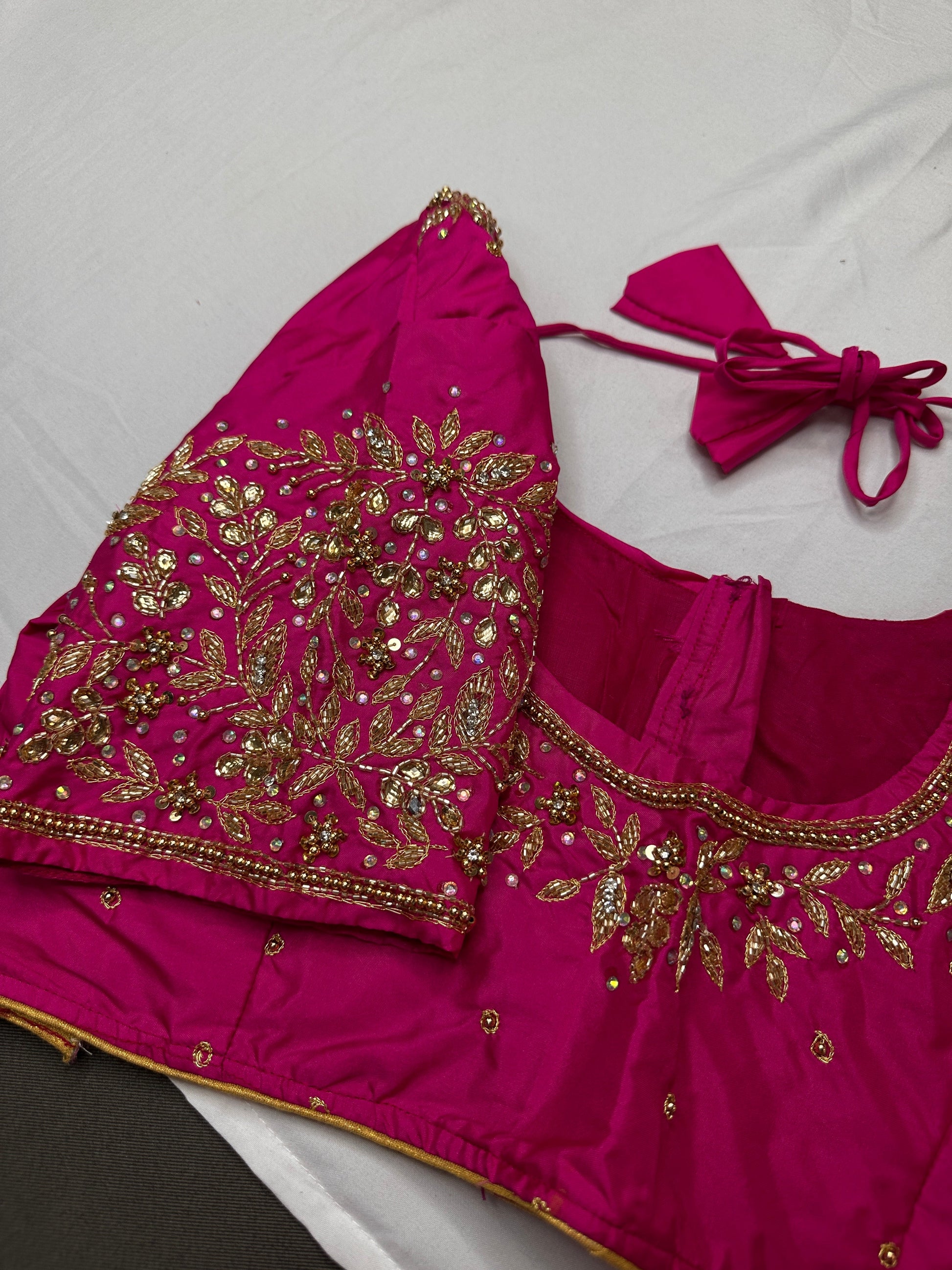 Blouse Details : Blouse Color : Pink; Blouse stitched Size 38 and can be altered from 36 to 42, Sleeves Length : 9 Inches, blouse Length 14.5 Inches, FrontNeck : 7 Inches and Back Neck : 9.5 Inches;