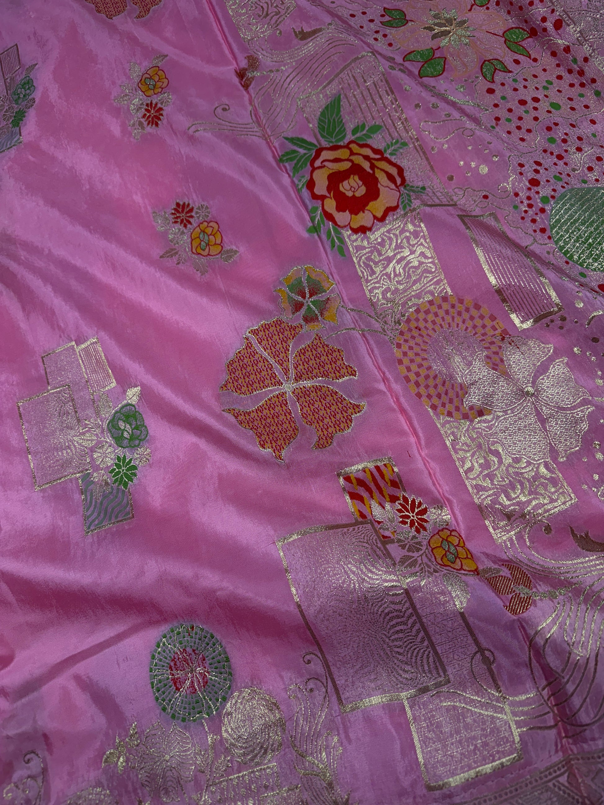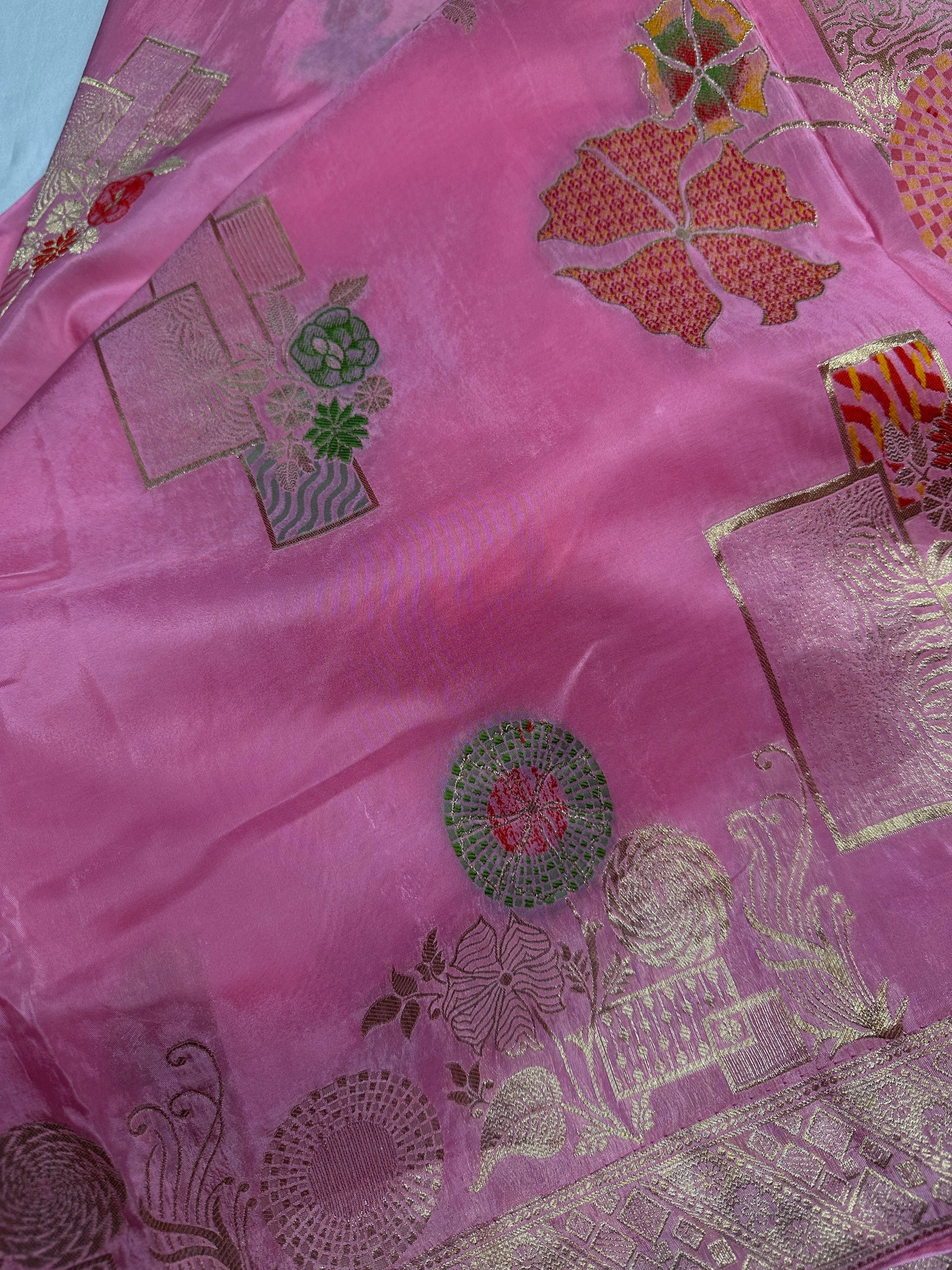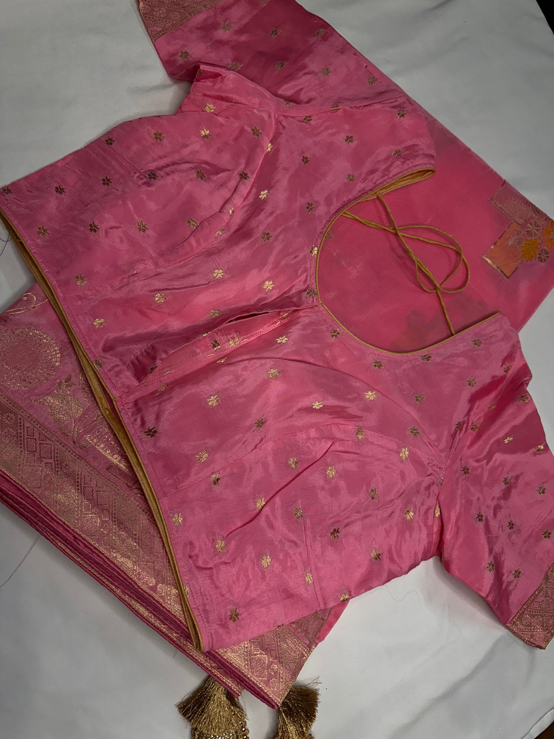 Pink Banarsi Crepe Floral Weaving Saree Saree Details : Pink Color Saree Fall and Pico done, Blouse Details : Pink Blouse Size 40 and has margin to go up to Size 46 Sleeves Length : 8 Inches: Blouse Length : 15 Inches; Front Neck : 7.5Inches; Back Neck : 10 Inches