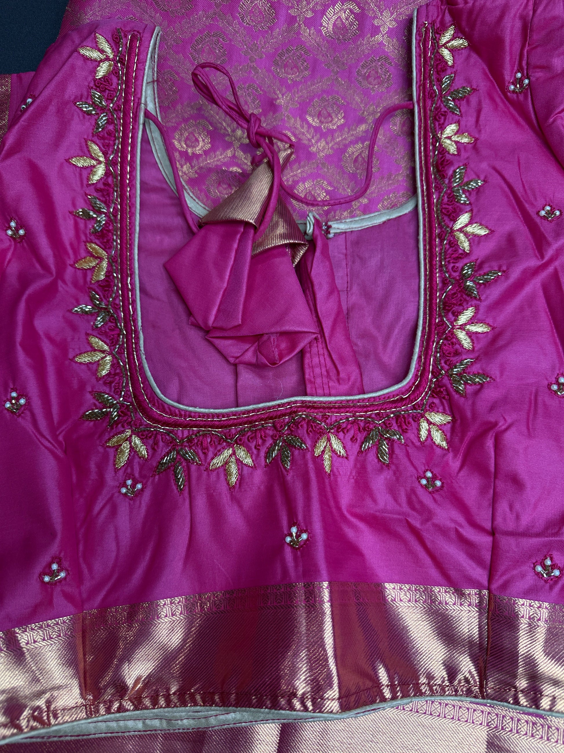 Pink Brocade Semi Kanchi Silk Saree Saree Details : Pink Color Saree Pink Pallu Fall and Pico done Blouse Details : Pink Blouse Size 40 and has margin to go up to Size 44; Sleeves Length : 8 Inches: Blouse Length : 15 Inches; Front Neck : 6 Inches; Back Neck : 9 Inches