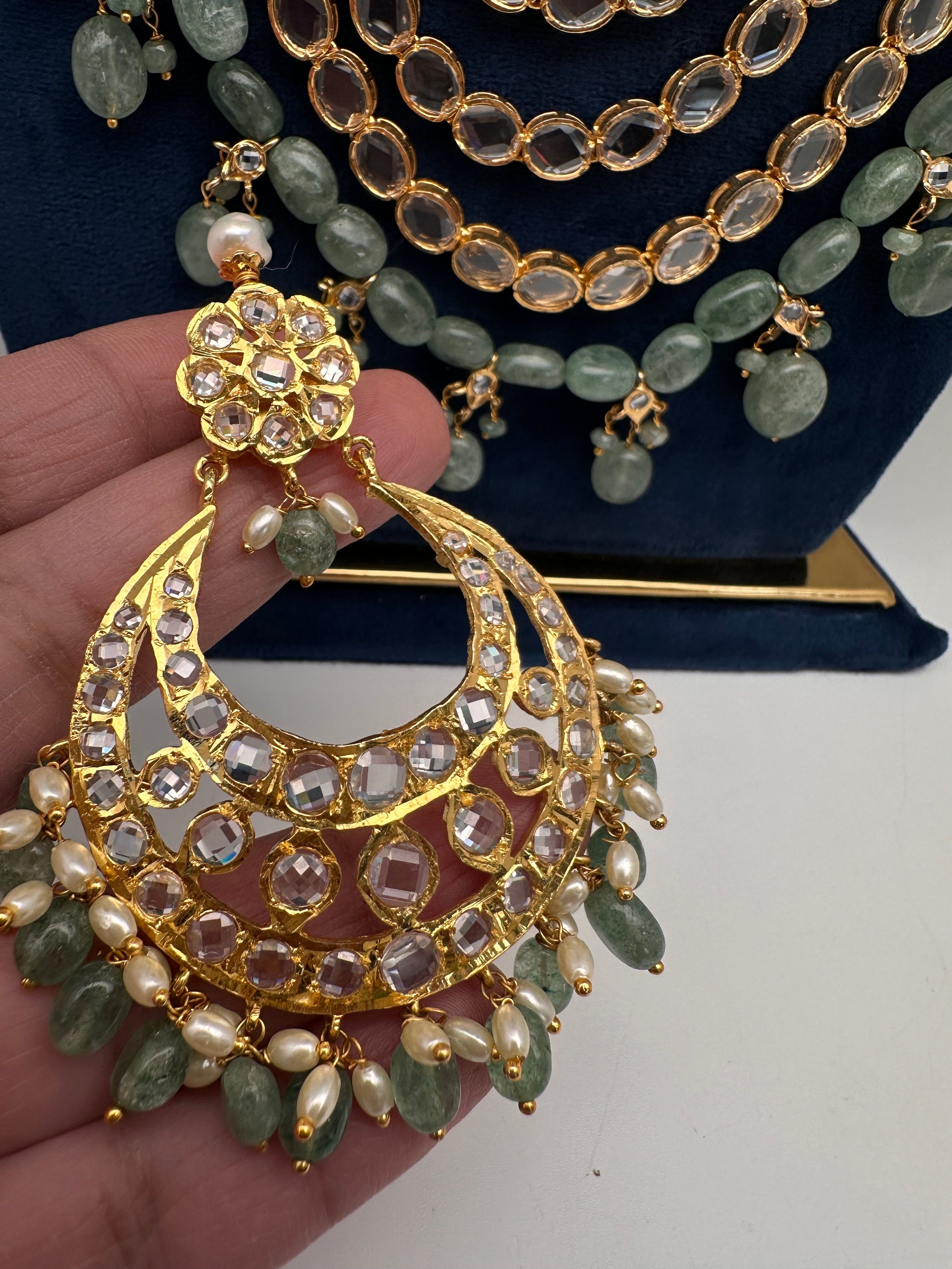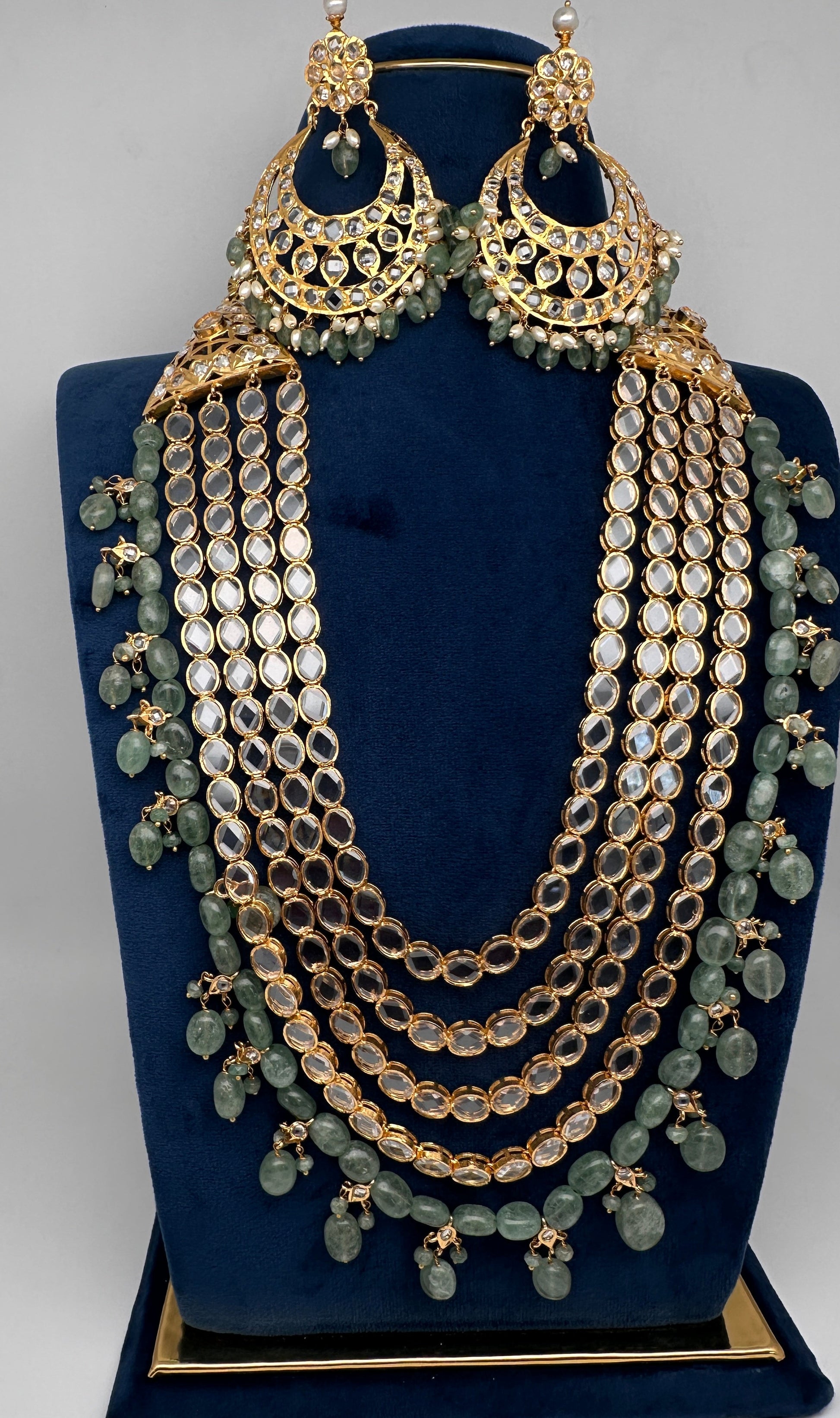 Polki CZ 6 Carat Gold Plated Panch Lada Emerald Necklace Chandbali with matching earringsColor : Golden ADSize : Necklace Length : Approx 24 Inches; Earrings Length : 3.5 Inches;Stones : Clear AD Stones Emerald Beads