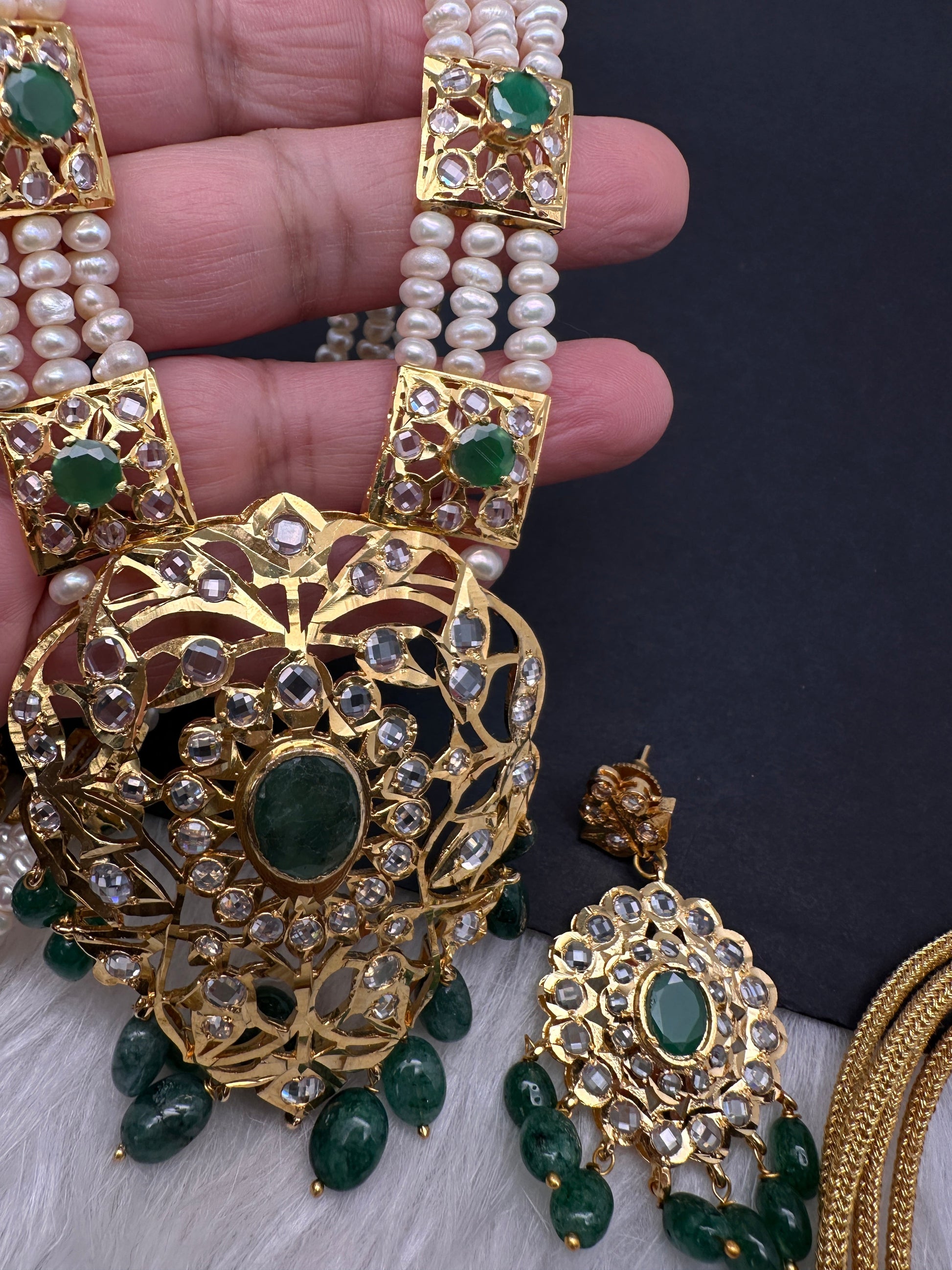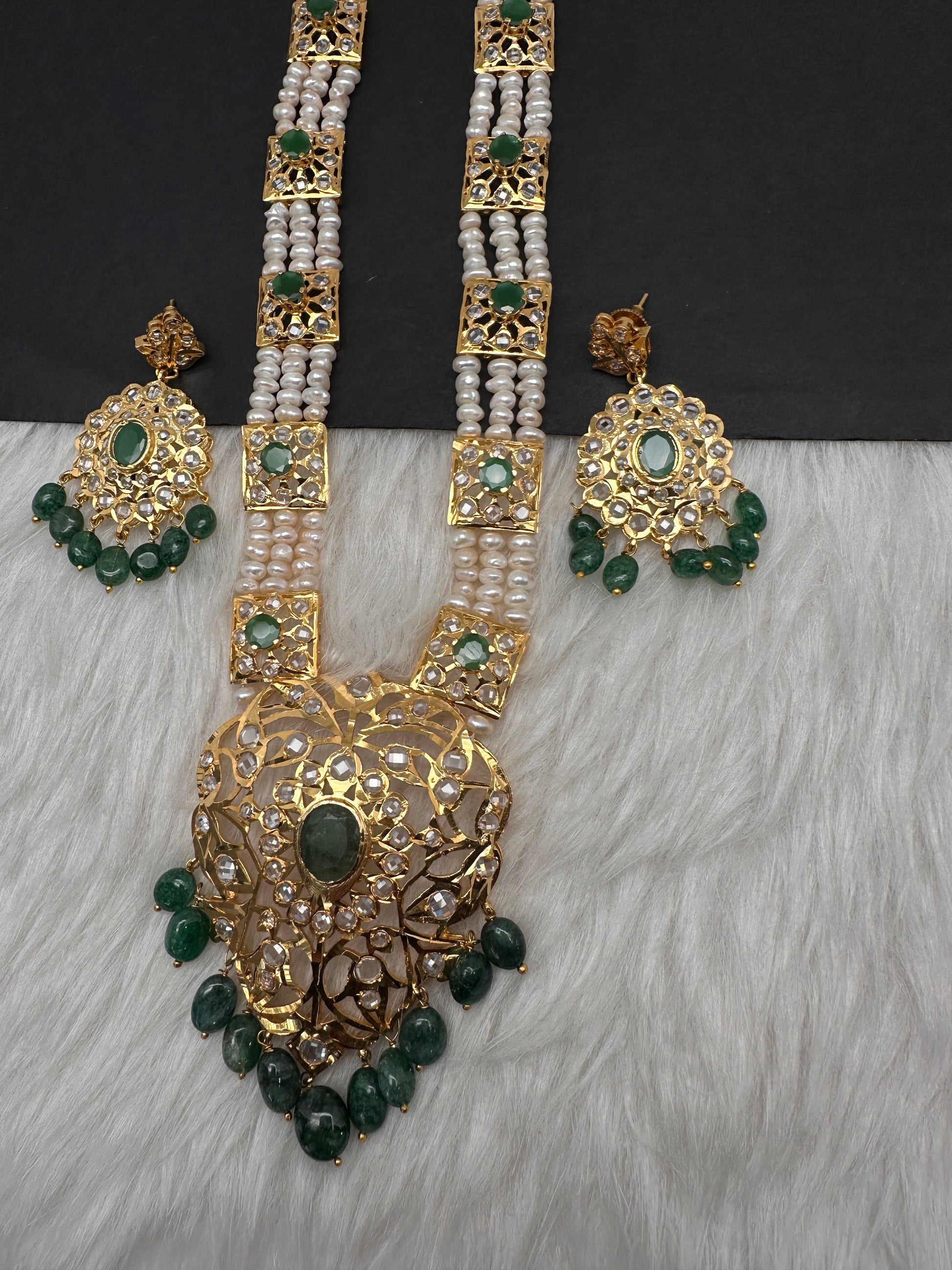 Polki CZ 6 Carat Gold Plated Real Pearls Emerald Necklace with matching earringsColor : Golden ADSize : Necklace Length : Approx 24 Inches; Earrings Length : 2.25 Inches;Stones : Clear AD Stones Emerlad Beads Pearls