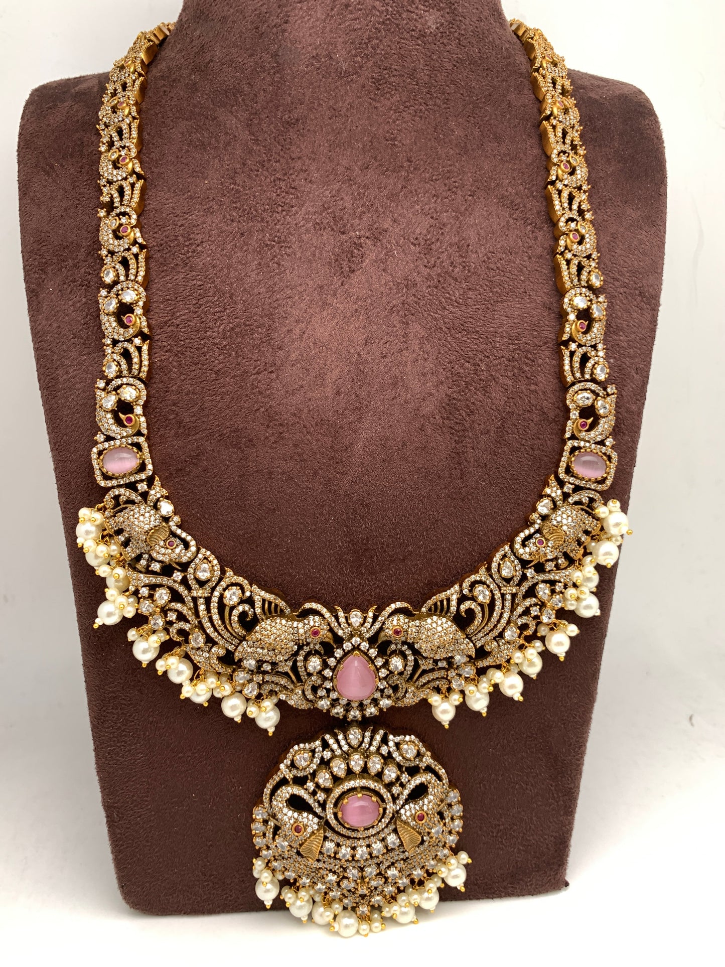 Polki Pink Stone Elephant Design Mehndi Polish Long Necklace with Matching Screwback Earrings Mehndi Finish gives a copper tone to the necklace Color : Victorian Size : Necklace Length : 24 Inches Approx; Earring Length : 2.25 inches; Stones : Polki Pink Stone Pearls