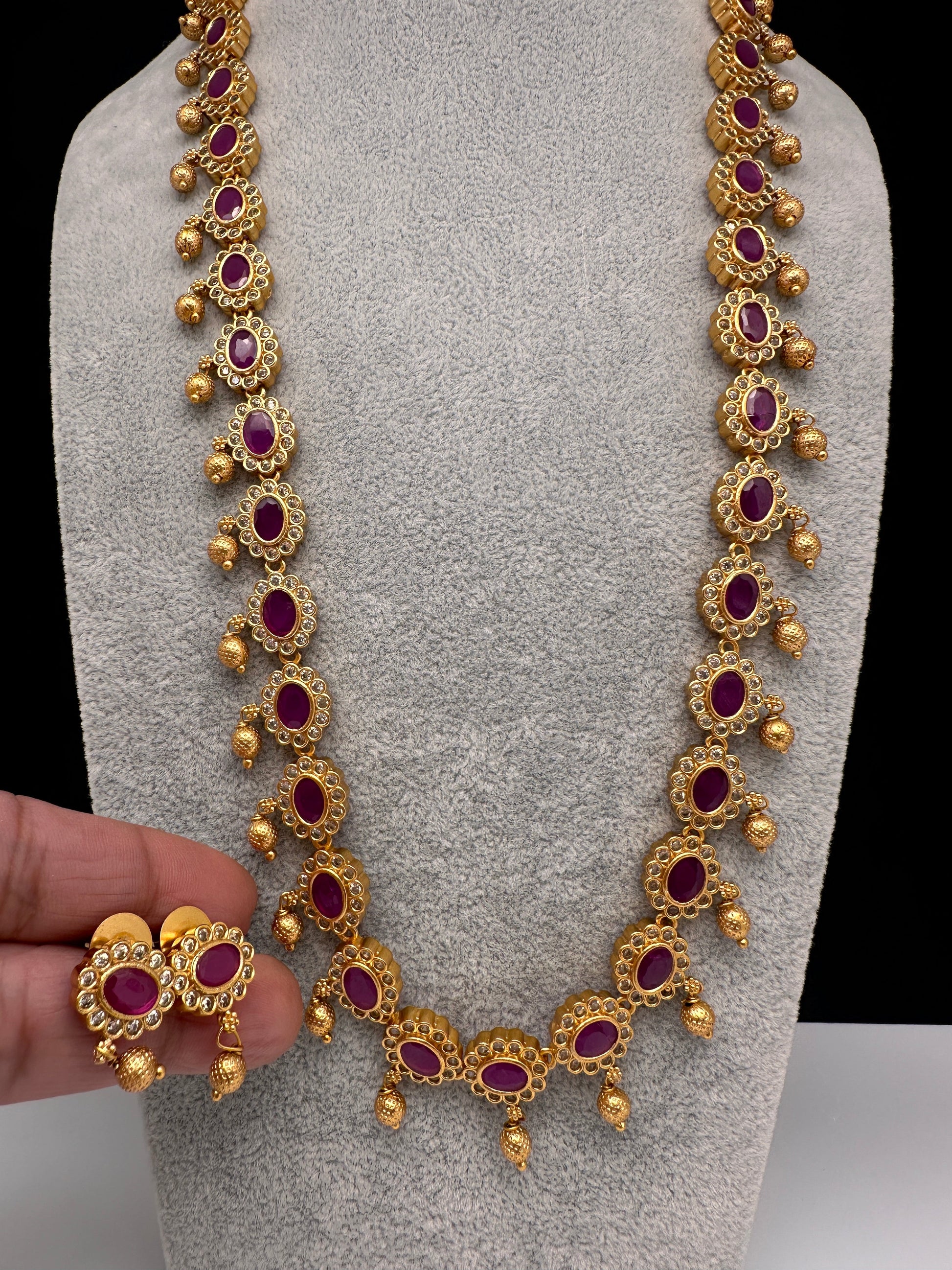 Premium Matte Ethnic Stone Long Necklace with matching screwback earringsColor : GoldSize : Necklace Length : 20 Inches; Earring Length : 0.75 Inches ApproxStones : Color-- Stone Gold Beads