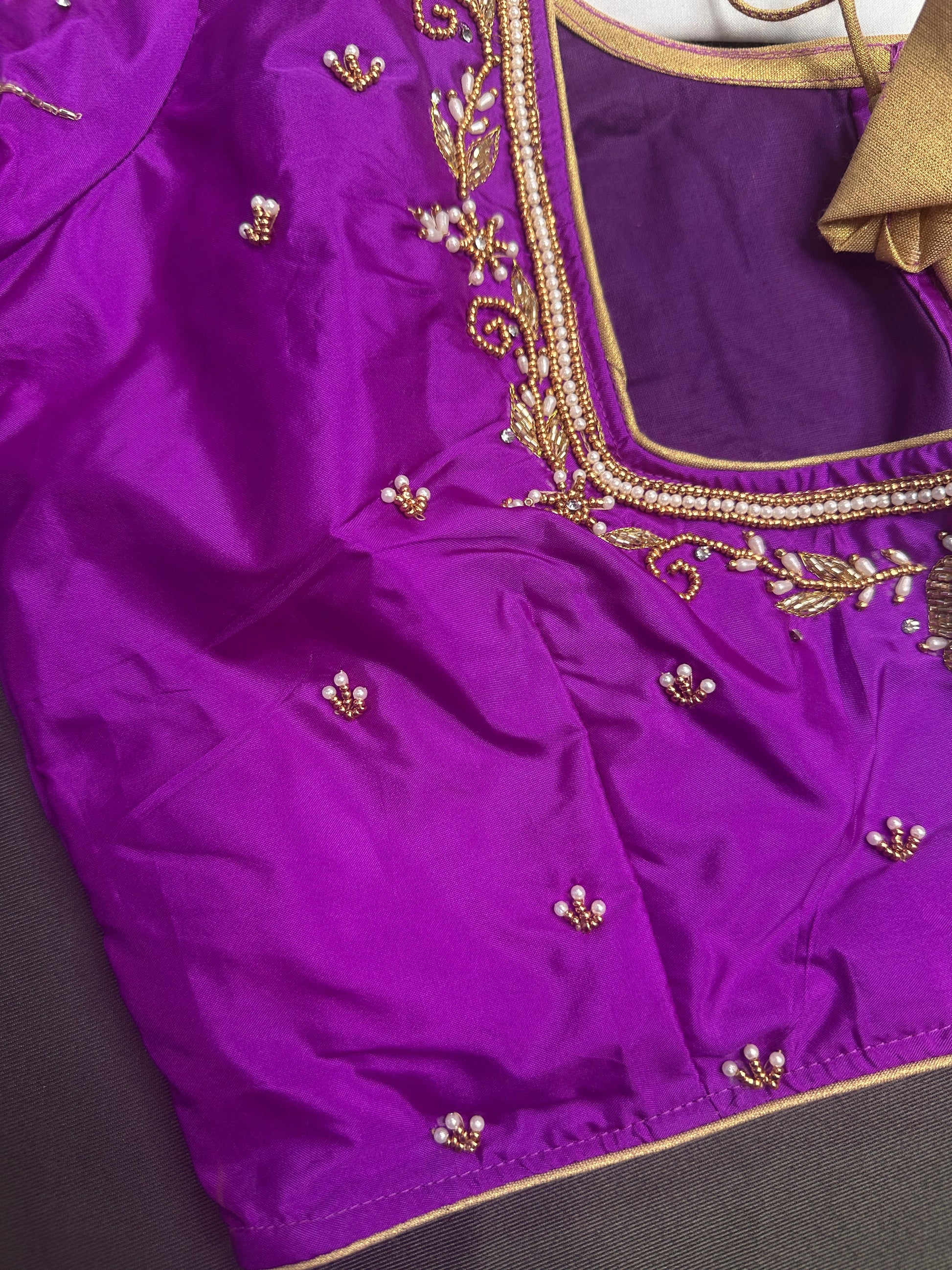 Blouse Details : Blouse Color : Purple; Blouse stitched Size 38 and has margin to open up to size 42, Sleeves Length : 9 Inches, blouse Length 14.5 Inches, FrontNeck : 6 Inches and Back Neck : High Neck;