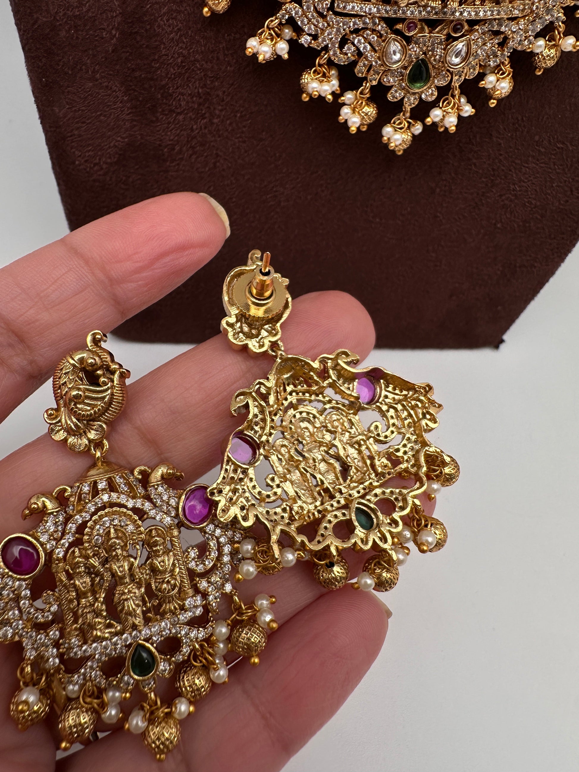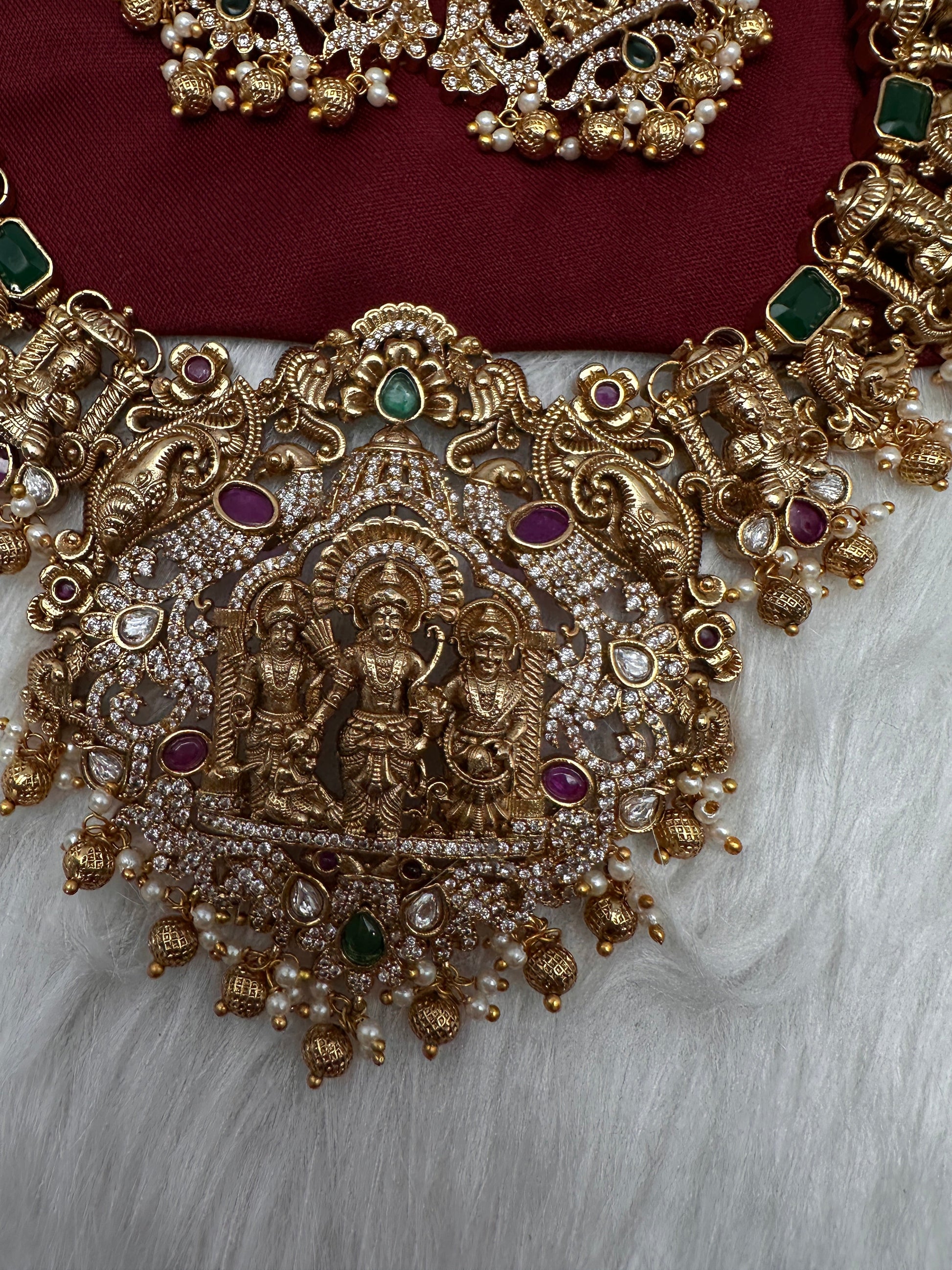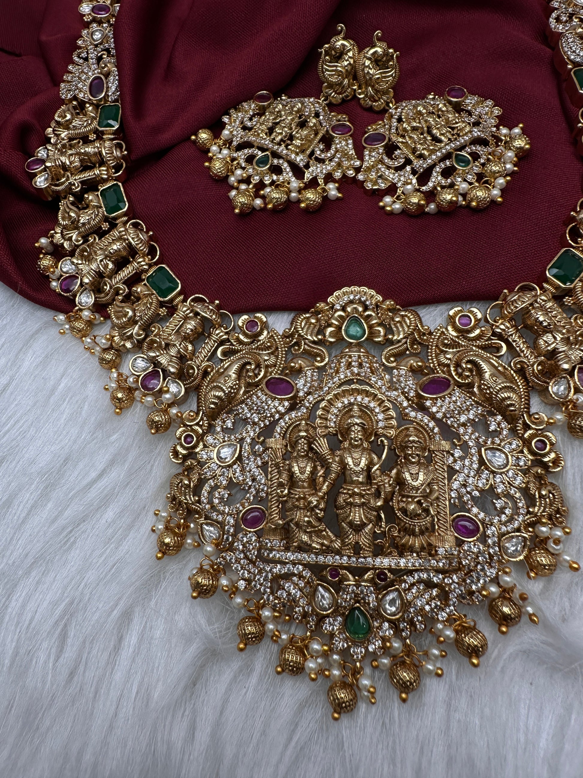 RamParivar Matte Nakshi Long Necklace with matching earringsColor : MatteSize : Necklace Length : 24 Inches; Earring Length : 2.25 Inches Approx; Stones : Kempu Pearls Purple Beads