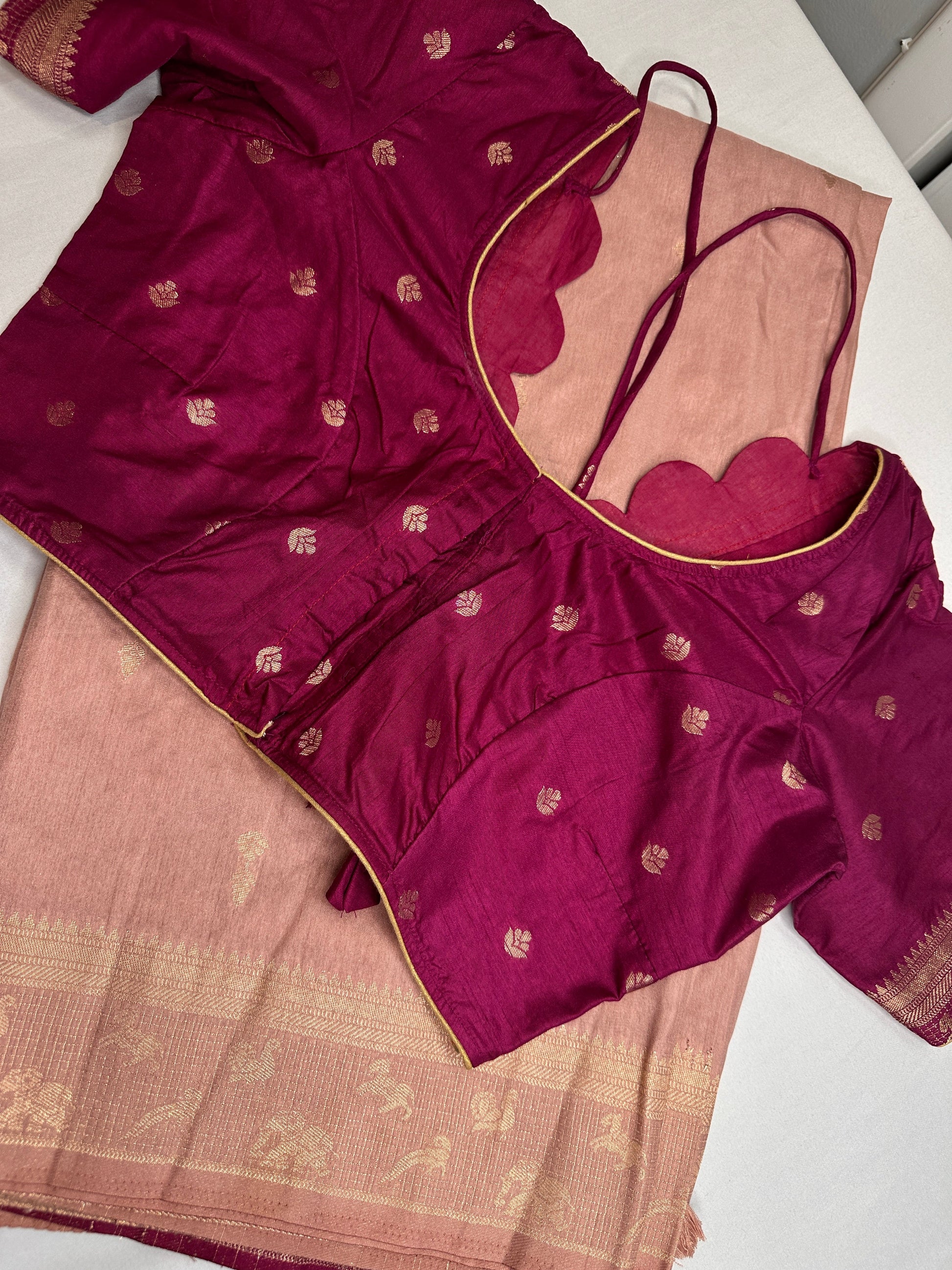 Blouse Details : Pink Blouse Size 40 and has margin to go up to Size 46; Sleeves Length : 9 Inches: Blouse Length : 15 Inches; Front Neck : 7 Inches; Back Neck : 10 Inches Inches