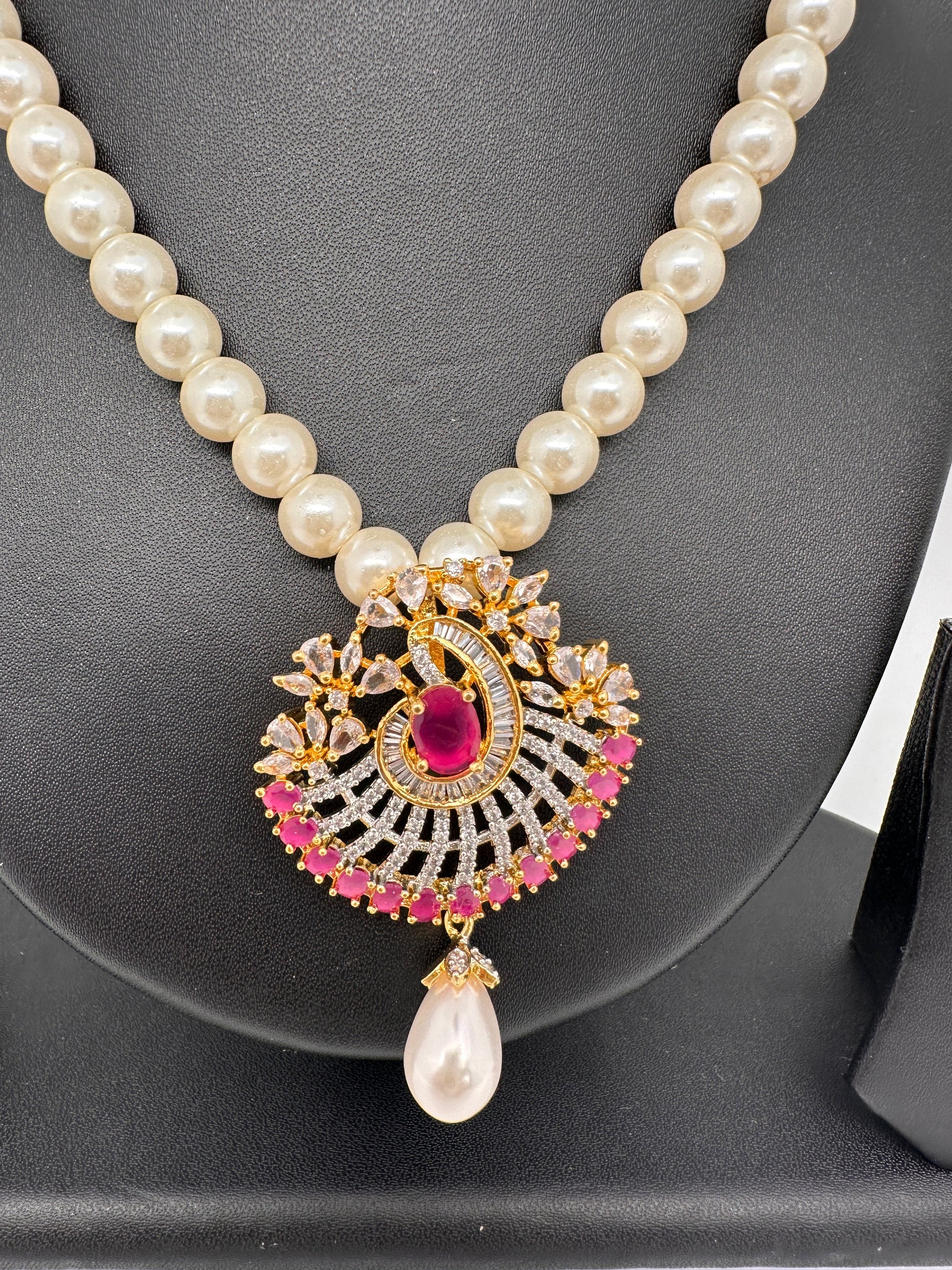 Red AD Pendent with Shell Pearl Necklace with matching earrings