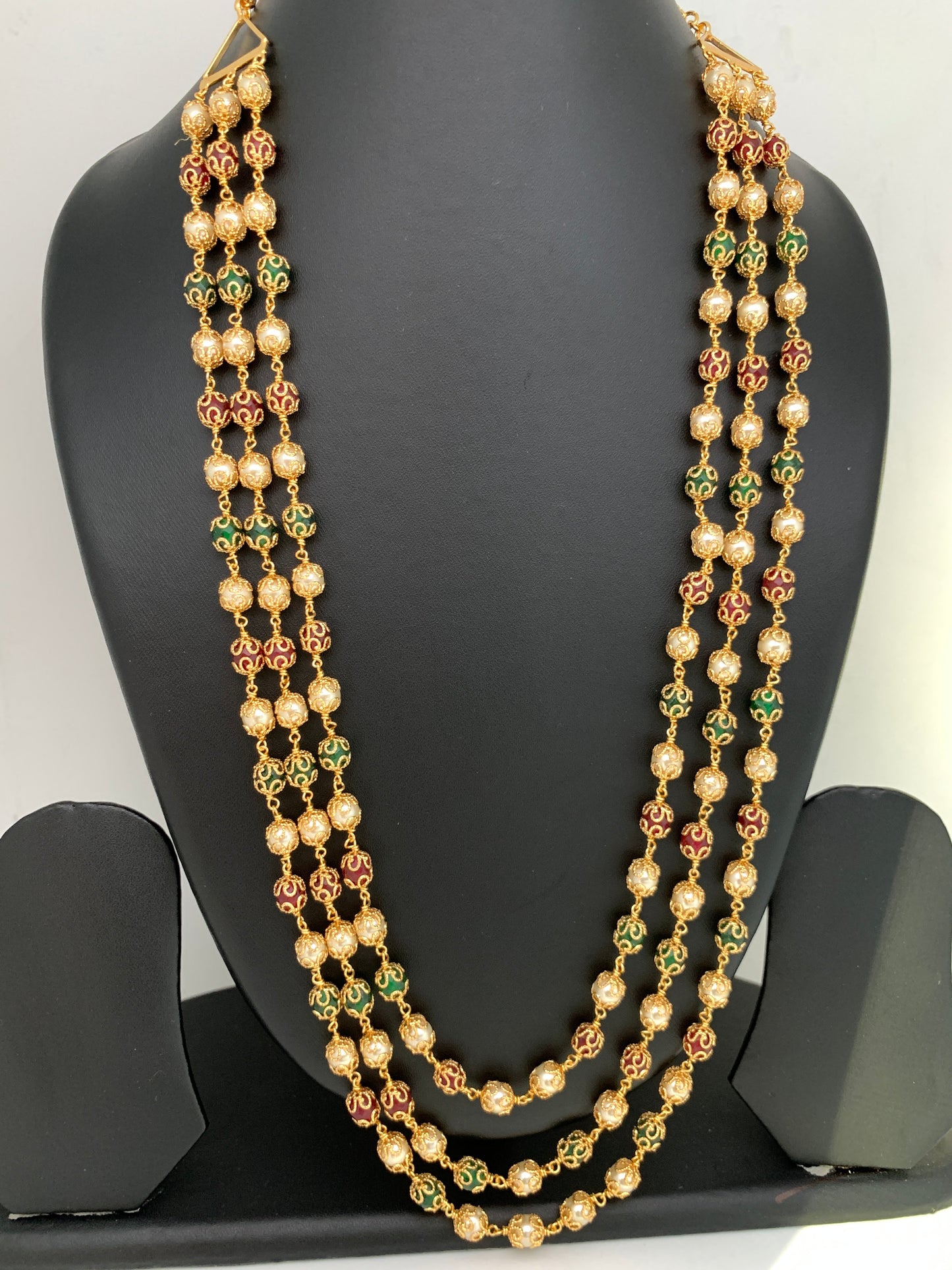 Red Green Multi Color Pearls Three Line Golden Mala Only Mala No EarringsColor : GoldenSize : Necklace Length : 24 InchesStones : Red Green Pearls