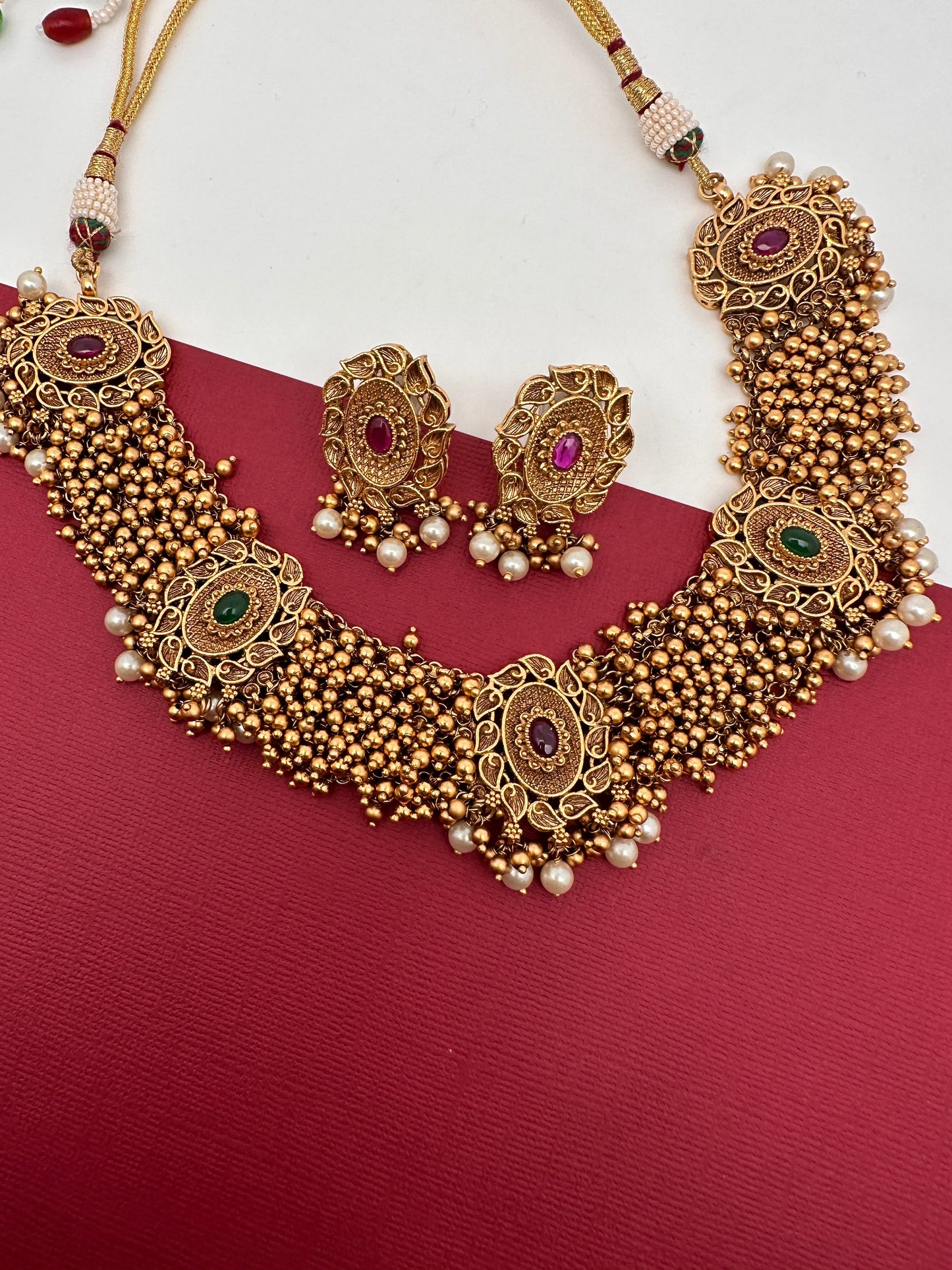 Red Green Stone Cluster Golden beads Ethnic Necklace with Matching earringsColor : GoldenSize : Nekclace Length : 16 Inches approx; Earring Length : 1.5 Inches ApproxStones : Red Green Stone