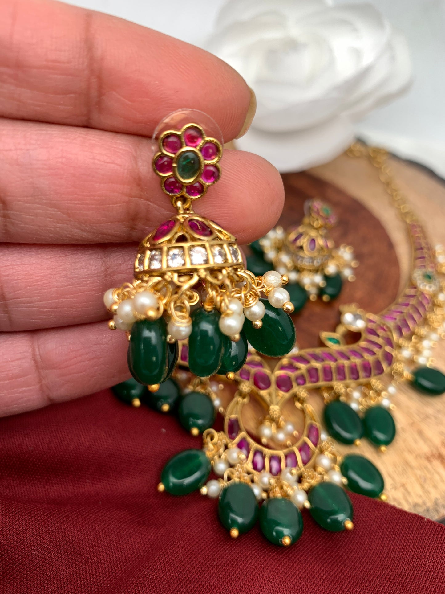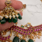 Red Kemp Green beads Neckline Ethnic Necklace with Matching Jhumki
