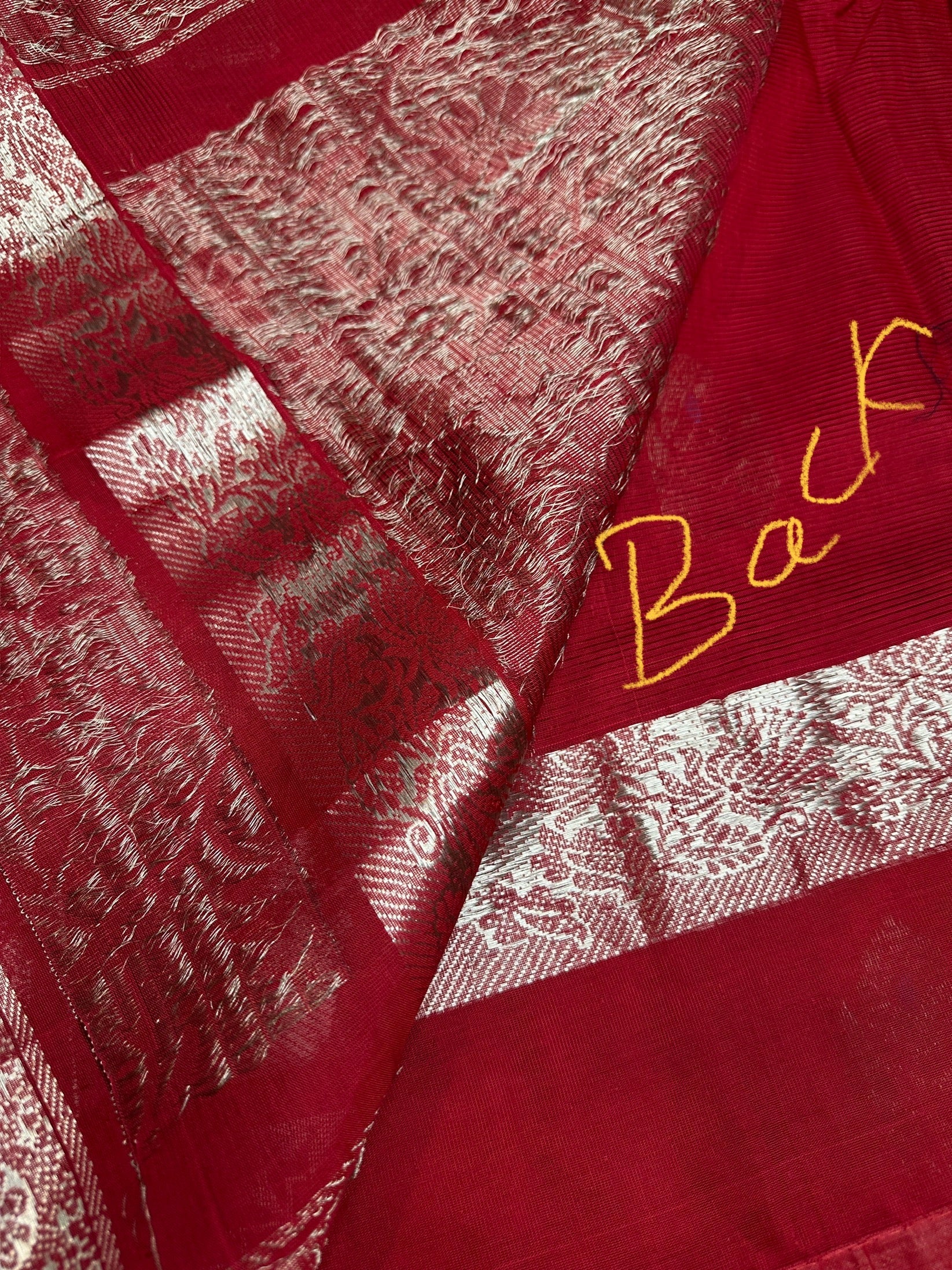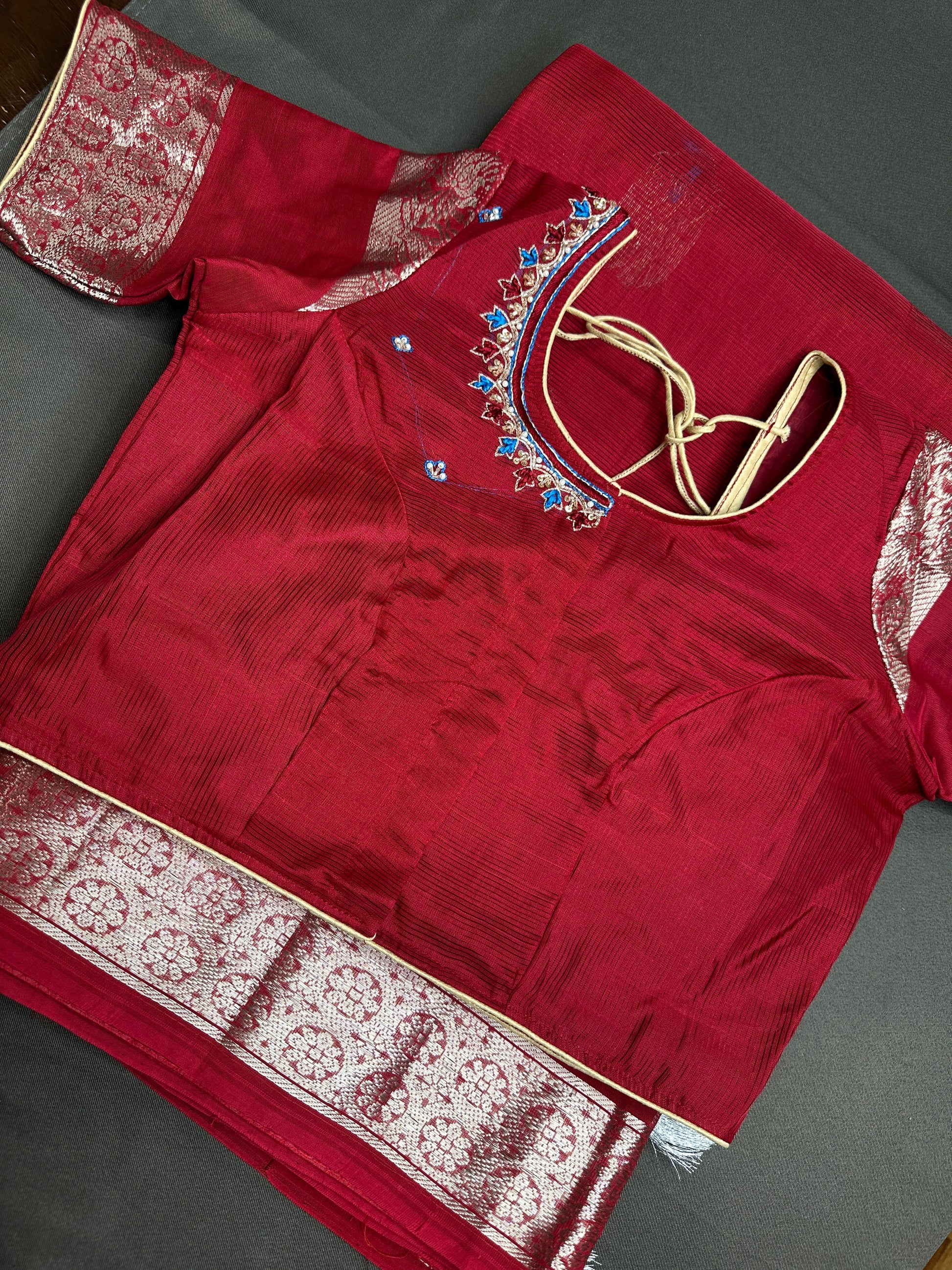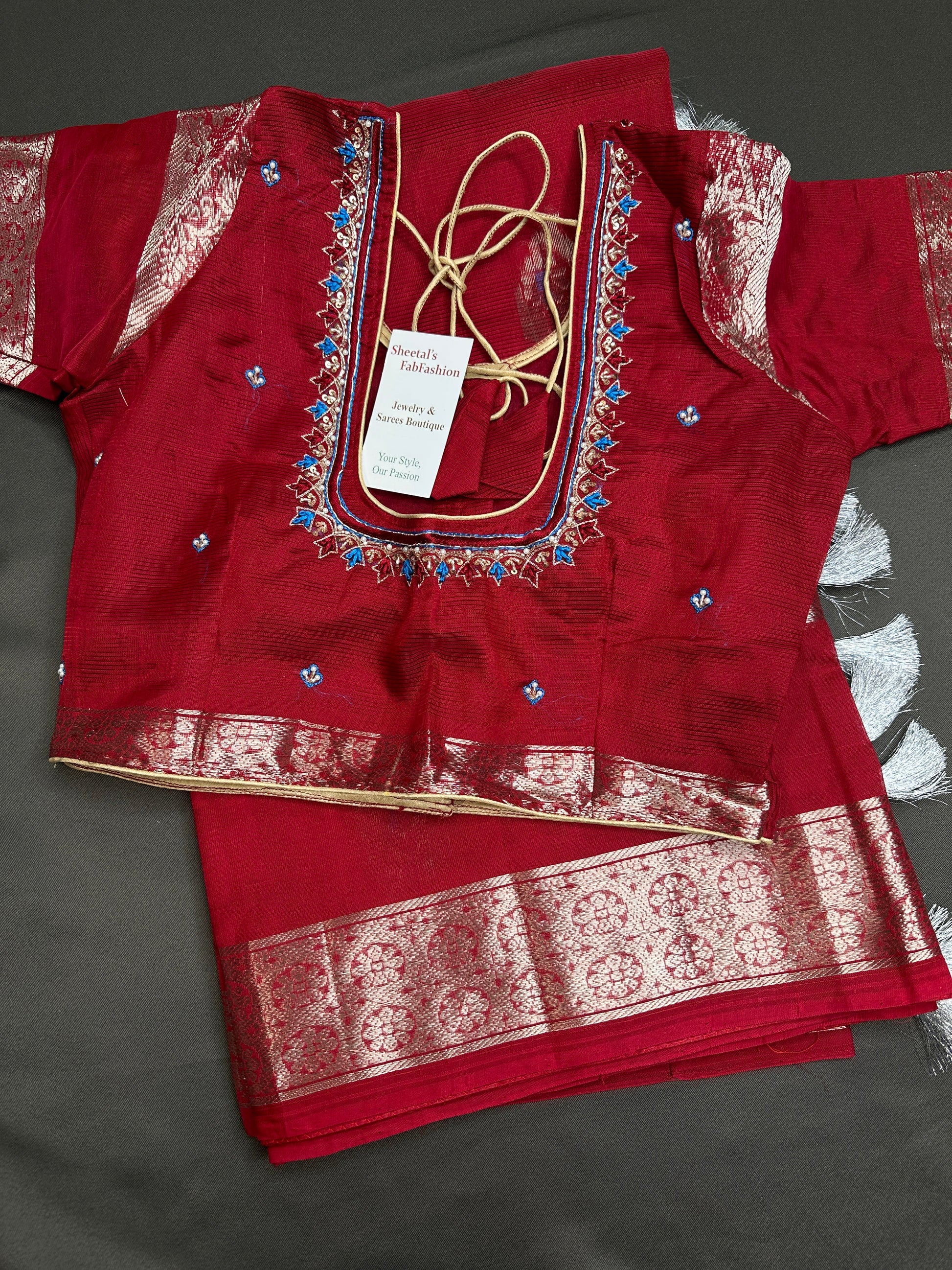 Red Mangalgiri Pure Silk Handloom Saree Saree Details : Red Color Saree with Gap Border Fall and Pico done Blouse Details : Red Blouse Size 38 and has margin to go up to Size 42; Sleeves Length : 7 Inches: Blouse Length : 15 Inches; Front Neck : 7.5Inches; Back Neck : 10 Inches