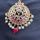 Red Stone Hyderabadi Jadau Pearls Golden MaangteekaColor : GoldenSize : Length : Approx 5 inchesStones : Red Stone Hyderabadi Jadau and Pearls