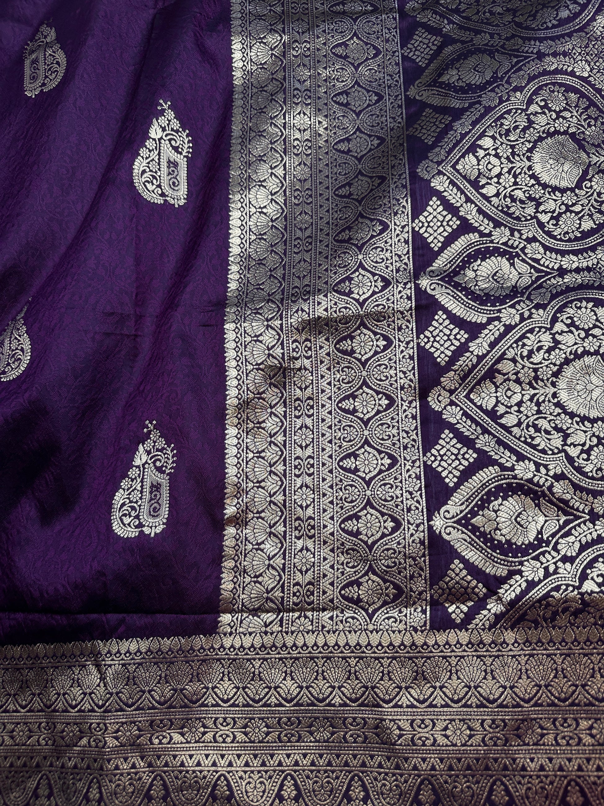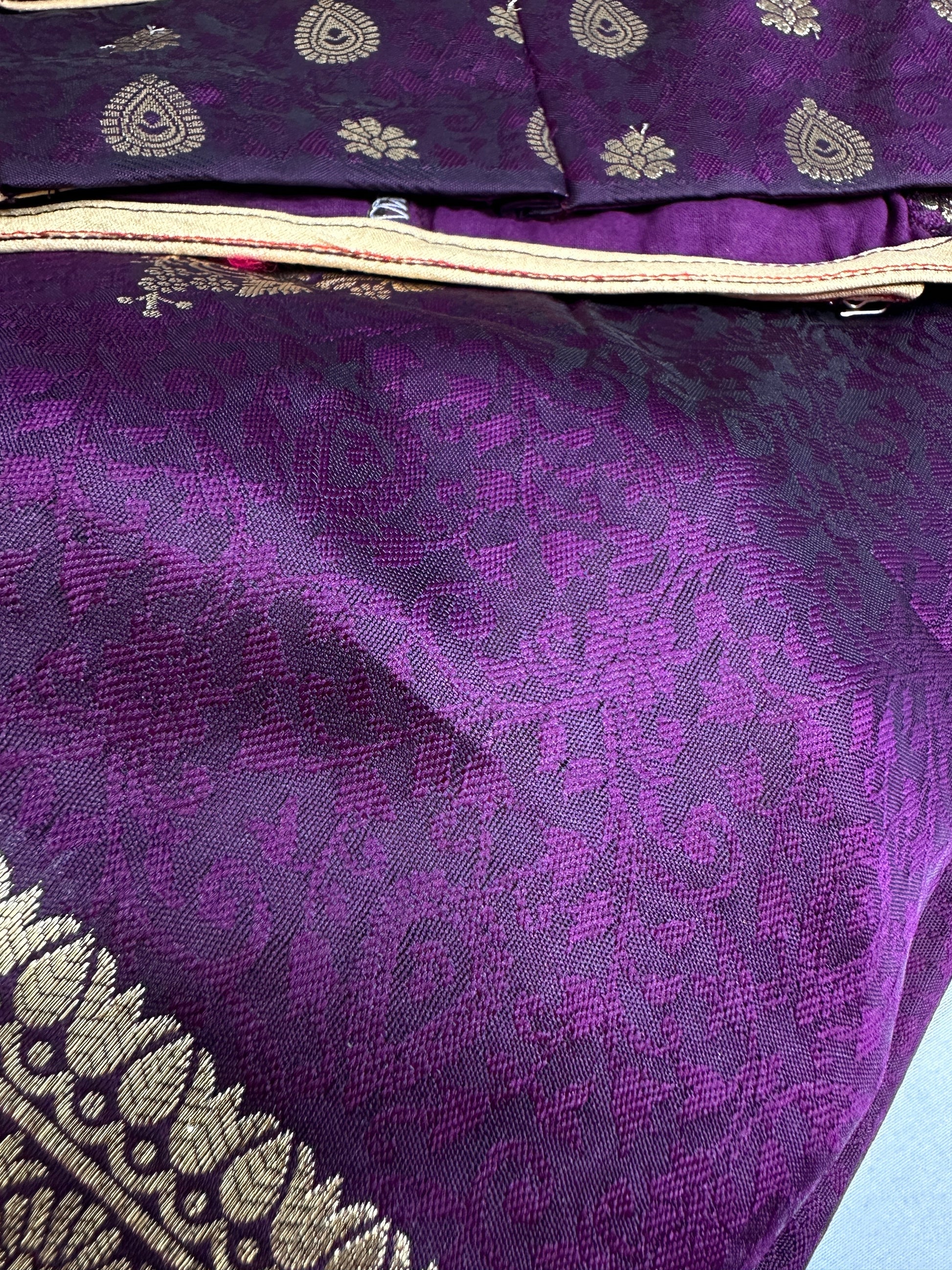 Self Weaving Purple Zari Silk Saree Saree Details : Purple Color Saree with Gold Weaving Pallu Fall and Pico done Blouse Details : Purple Blouse Size 38 and has margin to go up to Size 46; Sleeves Length : 9 Inches: Blouse Length : 15 Inches; Front Neck : 8 Inches; Back Neck : 10 Inches Inches