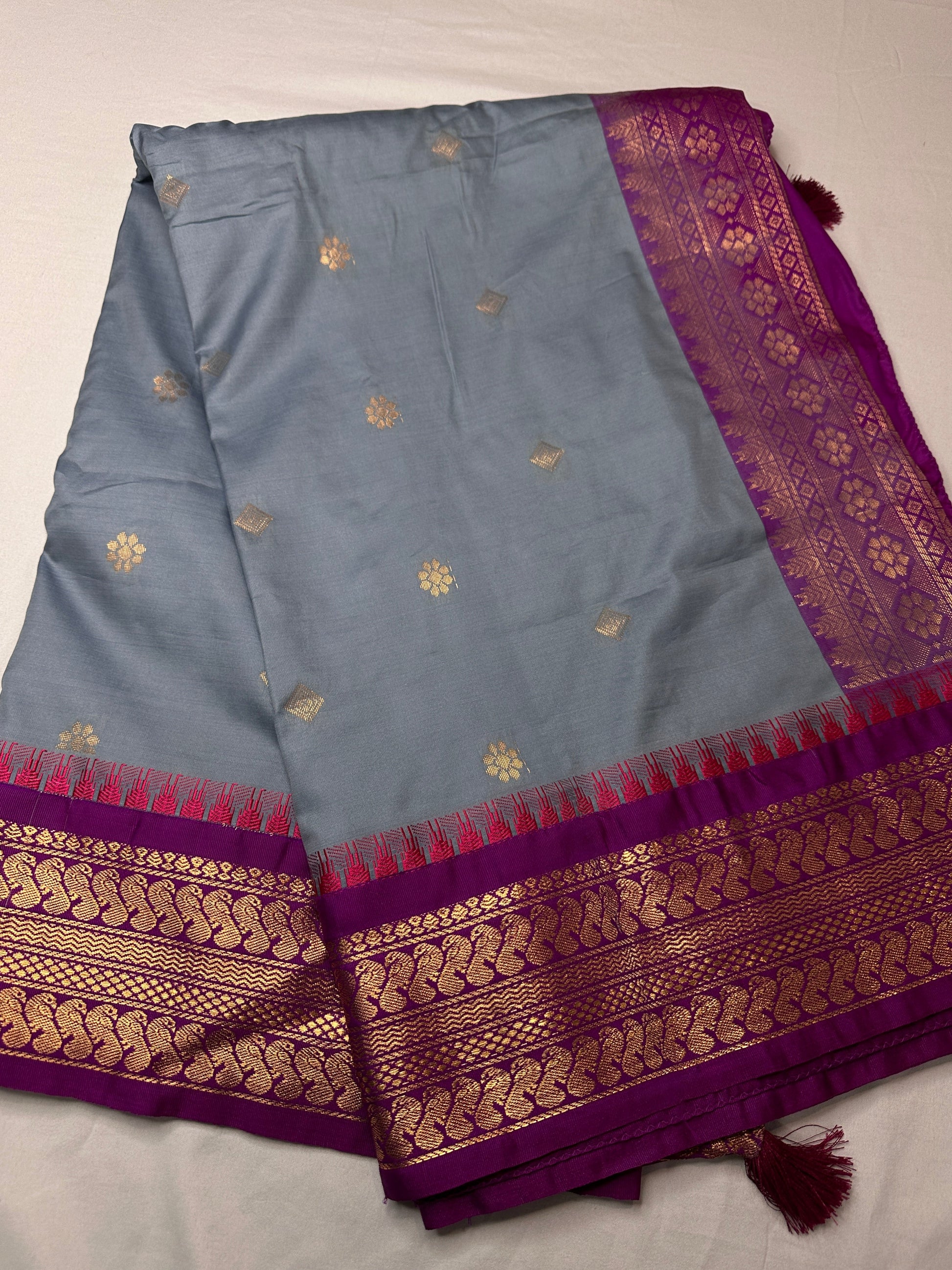 Semi Gadwal Silk Grey Purple Saree Saree Details : Grey Color Pallu Fall and Pico done Blouse Details : Magenta Blouse Size 38 and has margin to go up to Size 46; Sleeves Length : 10 Inches: Blouse Length : 15 Inches; Front Neck : 7 Inches; Back Neck : 10 Inches Inches