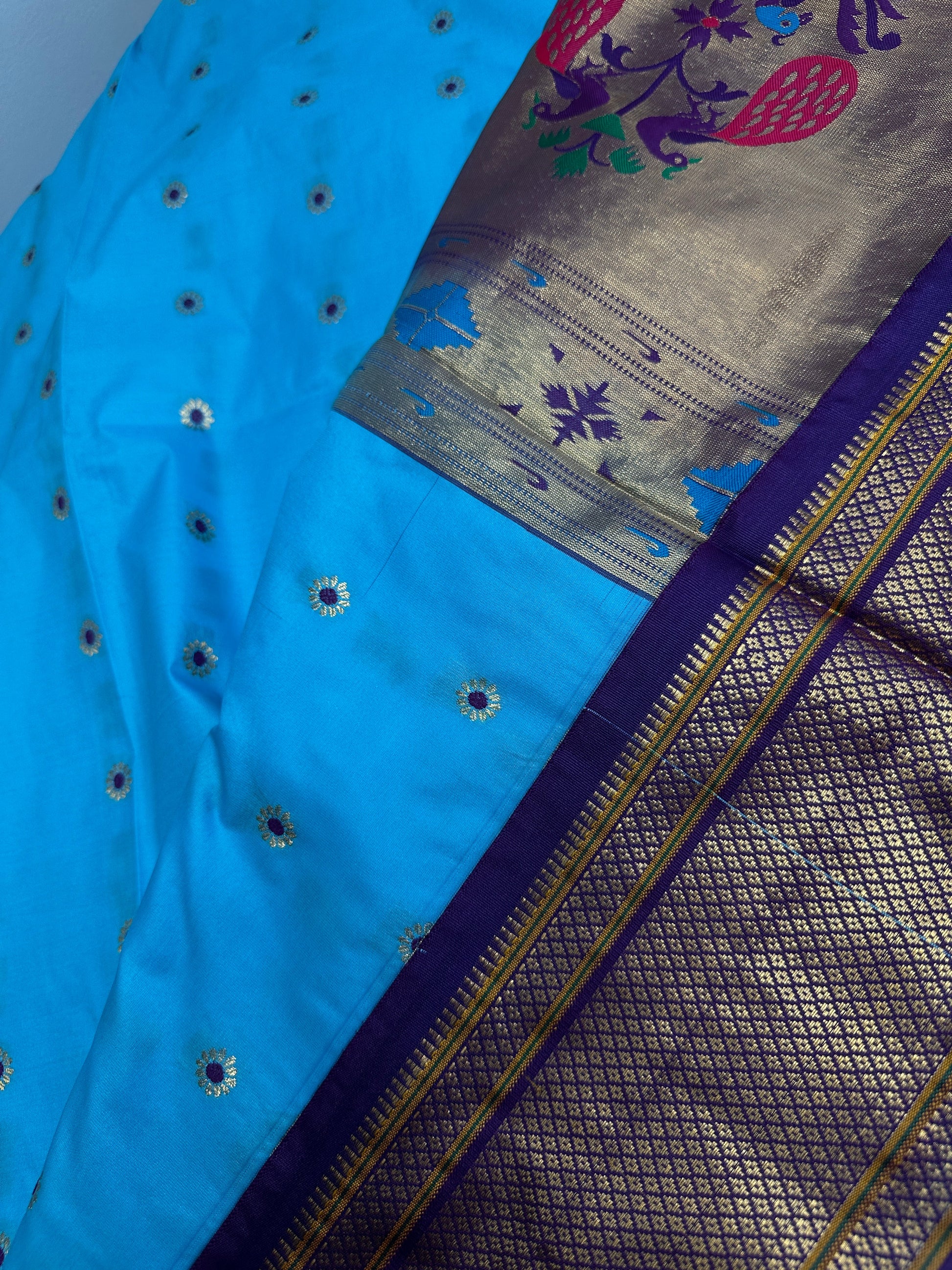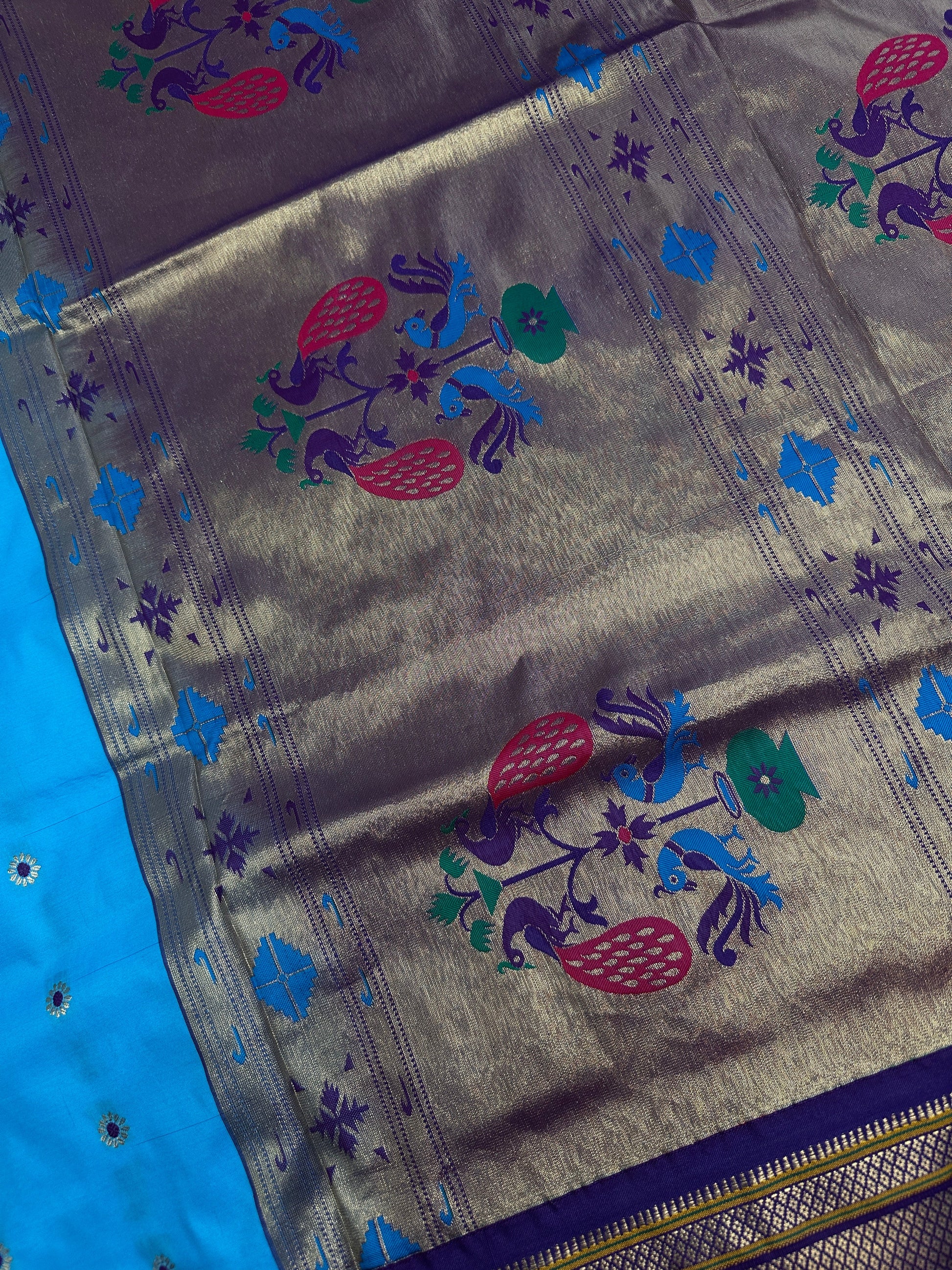 Semi Gadwal Silk Paithani Blue Purple Saree Saree Details : Blue Color Saree Purple Pallu Fall and Pico done Blouse Details : Purple Blouse Size 38 and has margin to go up to Size 46; Sleeves Length : 9.5 Inches: Blouse Length : 15 Inches; Front Neck : 7 Inches; Back Neck : 10 Inches Inches