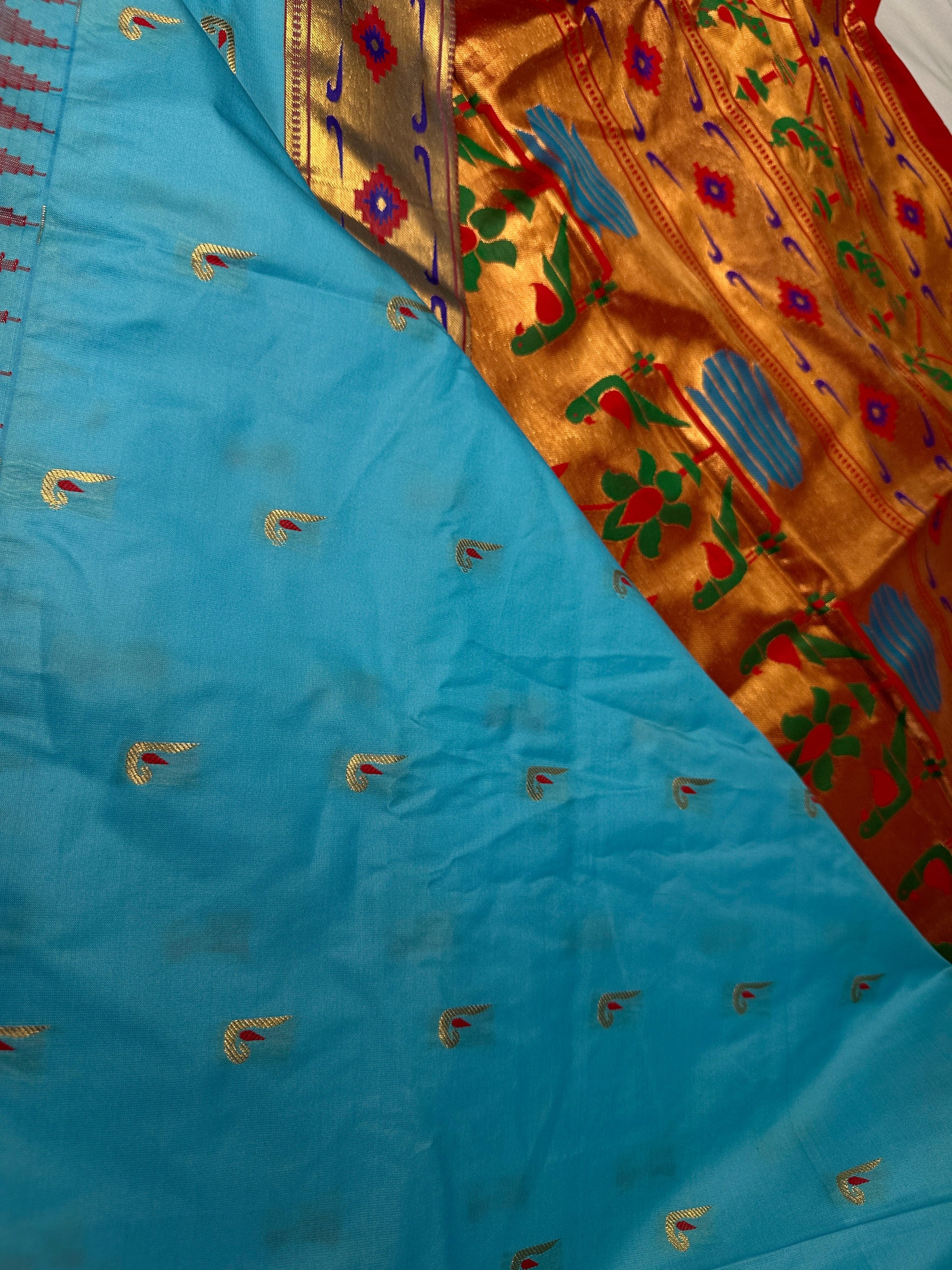 Semi Gadwal Silk Paithani Blue Red Saree Saree Details : Blue Color Saree Red Pallu Fall and Pico done Blouse Details : Red Blouse Size 38 and has margin to go up to Size 46; Sleeves Length : 9.5 Inches: Blouse Length : 15 Inches; Front Neck : 7 Inches; Back Neck : 10 Inches Inches