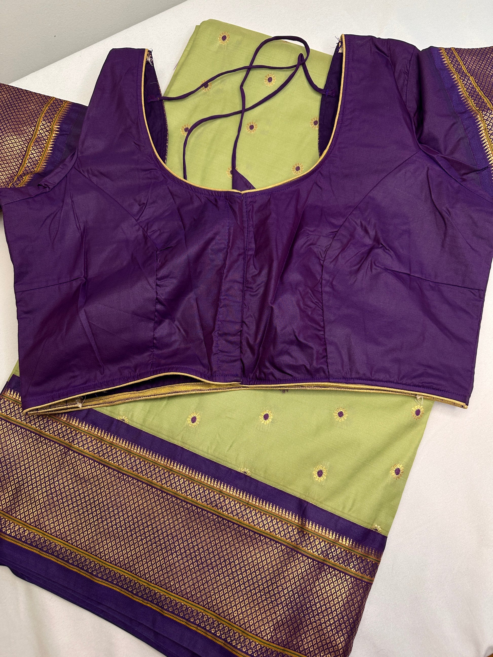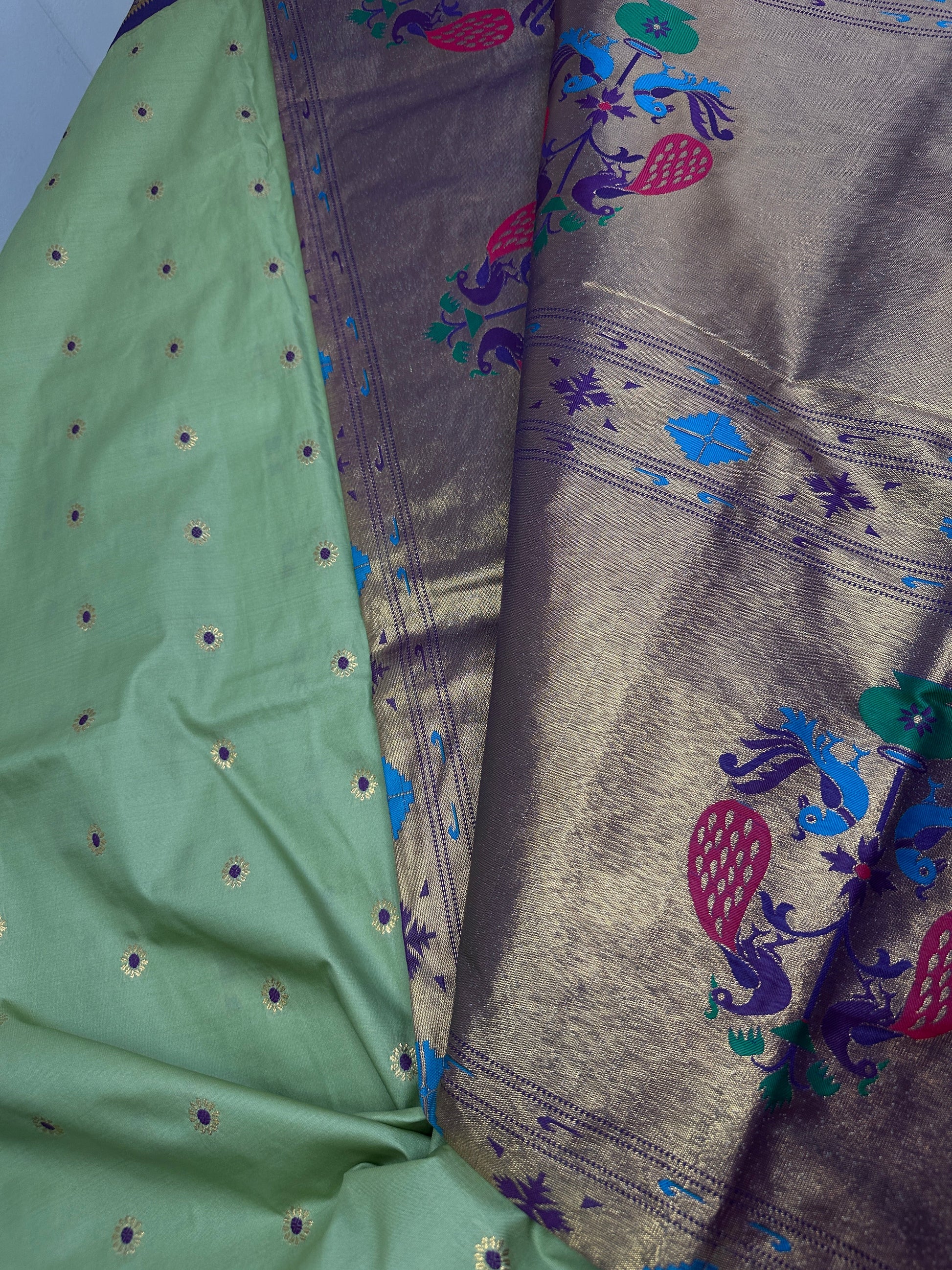 Semi Gadwal Silk Paithani Green Purple Saree Saree Details : Green Color Saree Purple Pallu Fall and Pico done Blouse Details : Purple Blouse Size 38 and has margin to go up to Size 46; Sleeves Length : 9.5 Inches: Blouse Length : 15 Inches; Front Neck : 7 Inches; Back Neck : 10 Inches Inches
