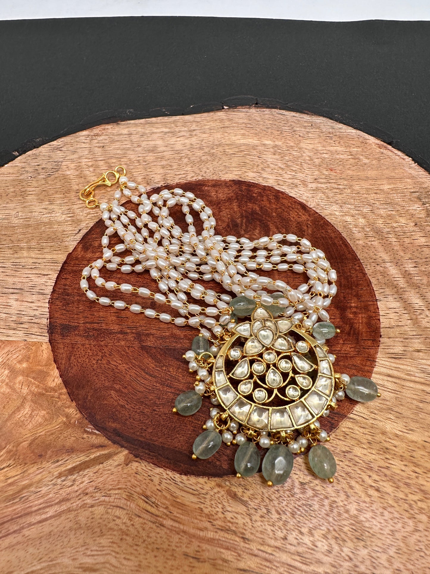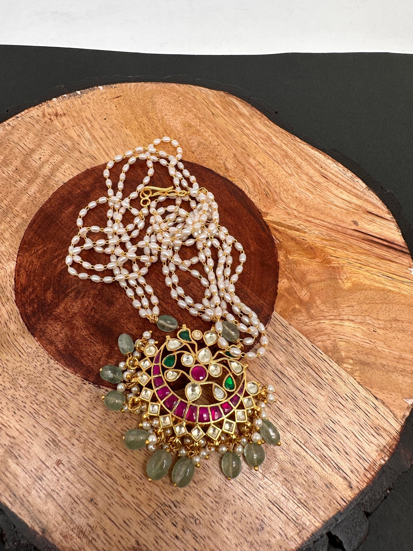 Simple Jadau Kundan Rice Pearls Necklace with matching earringsColor : GoldenSize : Necklace Length : 22 InchesStones : Red Green Jadau Kundan Rice Pearls