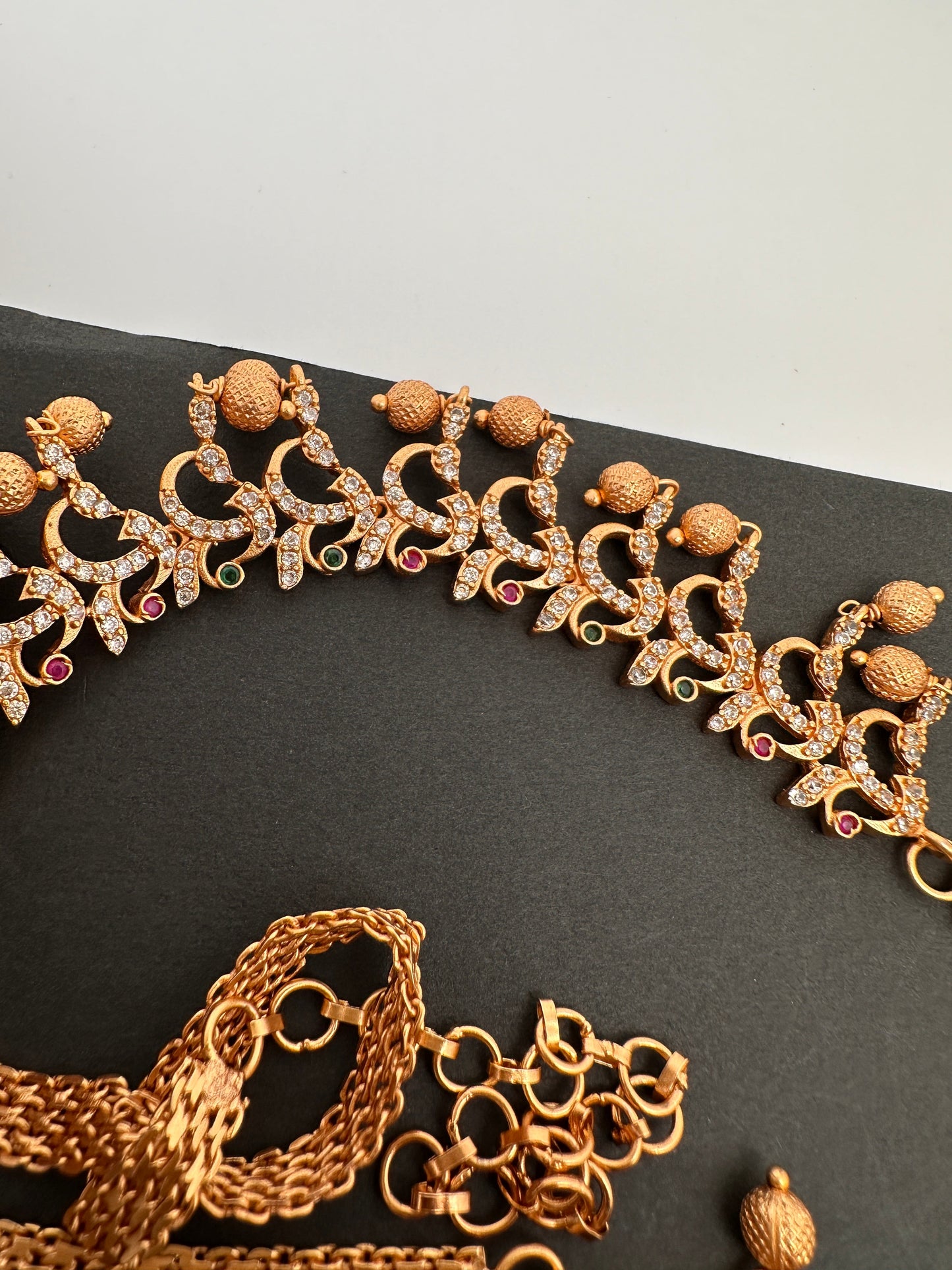 Sleek CZ Red Stone Matte Finish Hip Chain Vaddanam long around waist adjustable waist chain saree beltColor : Matte GoldSize : Maximum Length : 36 Inches; Minimum Length : 32 Inches; Front Design Length : 11 InchesStones : CZ Red Stone