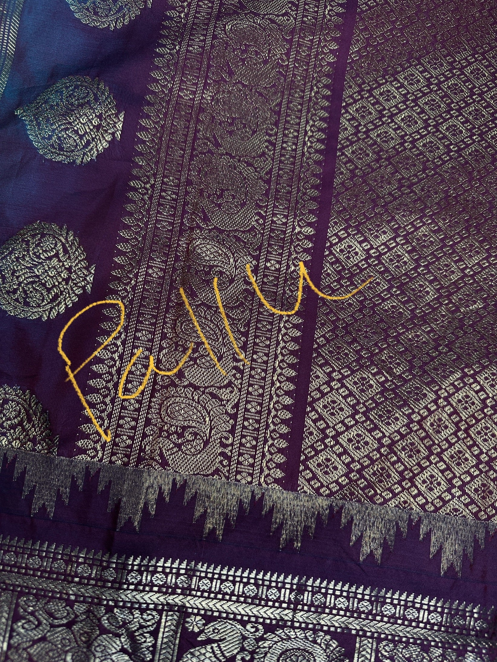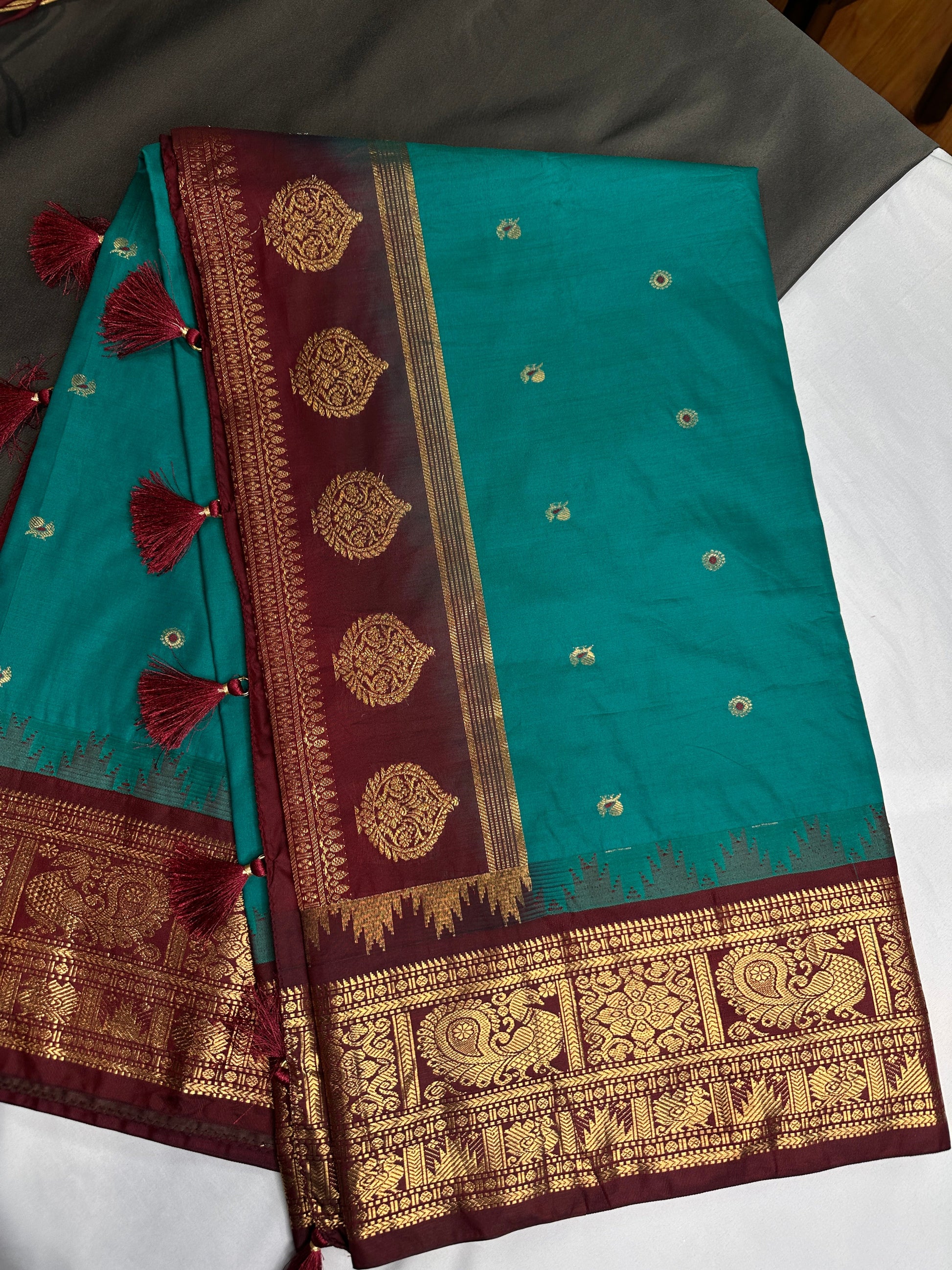 Small Border Semi Gadwal Silk Green Red Saree Saree Details : Green Color Saree Red Pallu Fall and Pico done Blouse Details : Red Blouse Size 38 and has margin to go up to Size 46; Sleeves Length : 9.5 Inches: Blouse Length : 15 Inches; Front Neck : 7 Inches; Back Neck : 10 Inches Inches