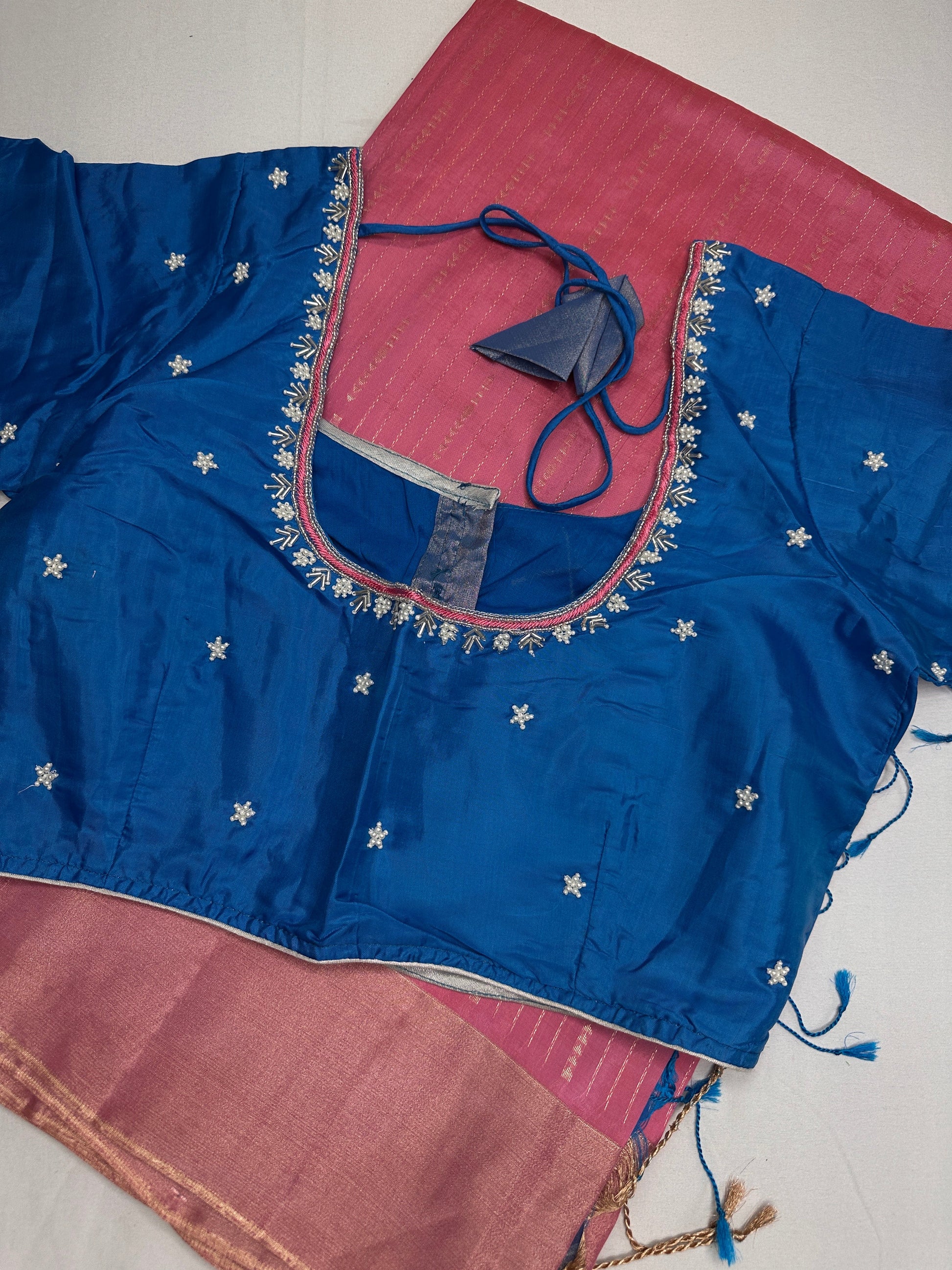 Blouse Details : Blue Blouse Size 38 and has margin to go up to Size 46; Sleeves Length : 9.5 Inches: Blouse Length : 15 Inches; Front Neck : 7 Inches; Back Neck : 10 Inches Inches