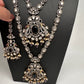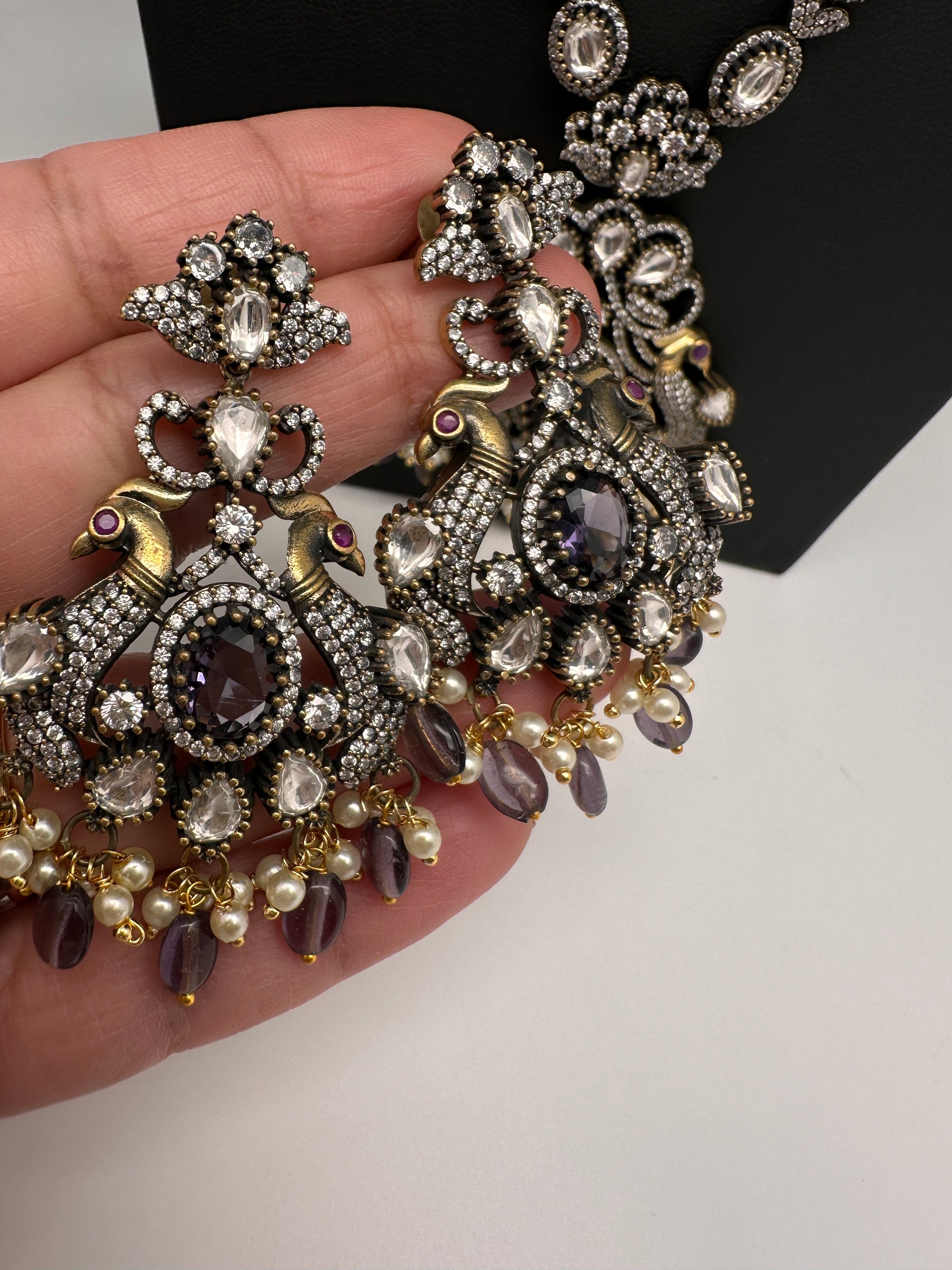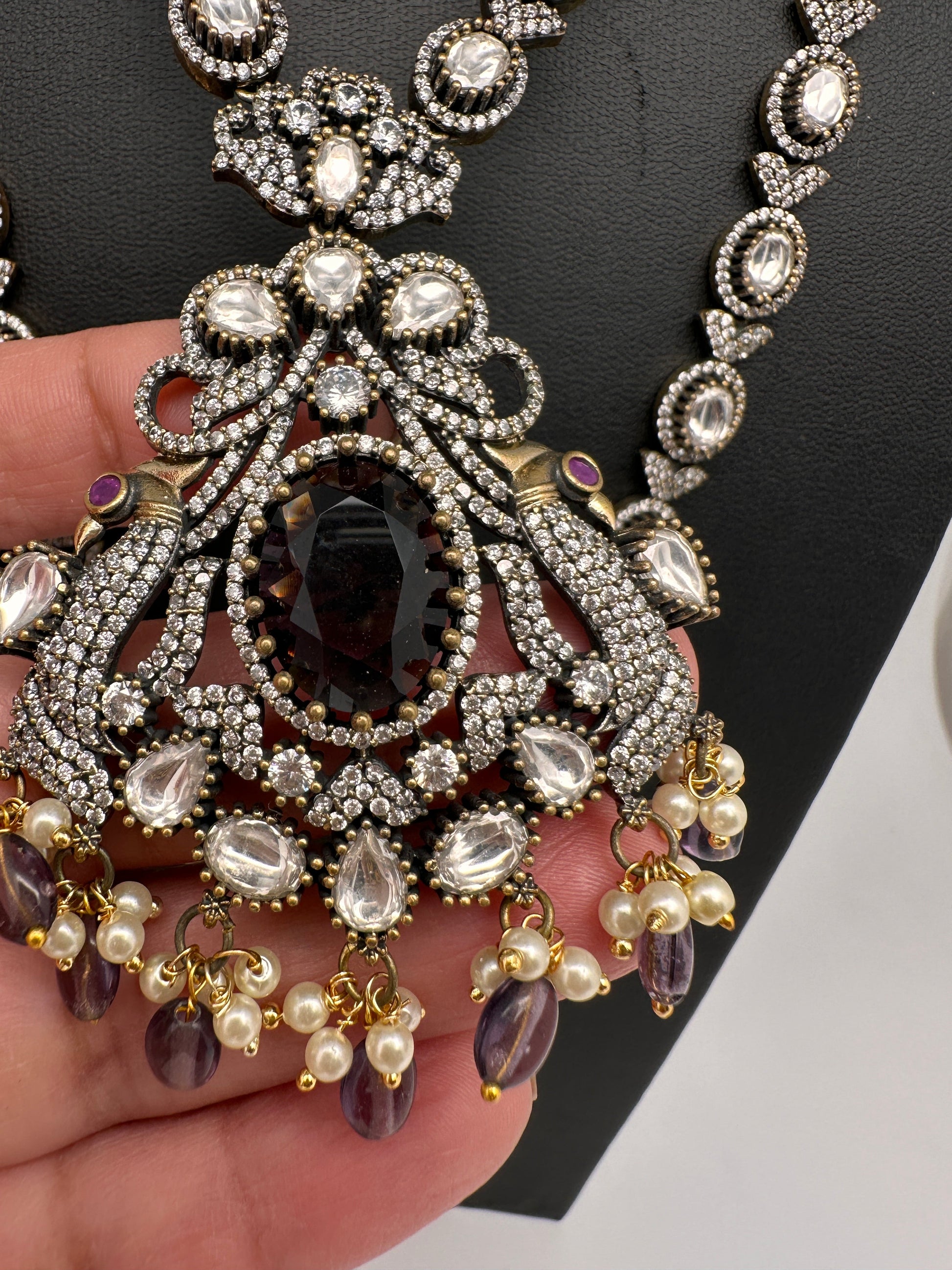 Victorian CZ Amethyst Purple Stone Combo Necklace with Matching EarringsColor : Victorian MehndiSize : Long Necklace 24 Inches; Short Necklace Length : 16 Inches; Earrings Length :2.5 Inches; Mang Tika 4 InchesStones : Amethyst Stone AD Pearls