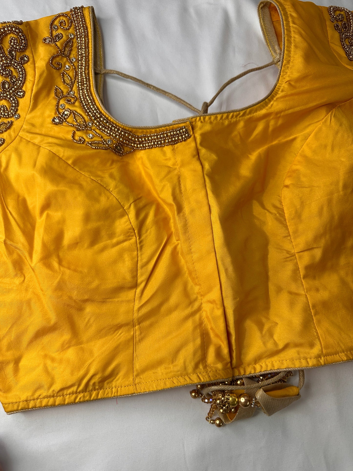Yellow Maggam work blouseBlouse Details : Blouse Color : Yellow; Blouse stitched Size 38 and can be altered from 36 to 44, Sleeves Length : 10 Inches, blouse Length 15 Inches, FrontNeck : 6 Inches and Back Neck : 9 Inches;